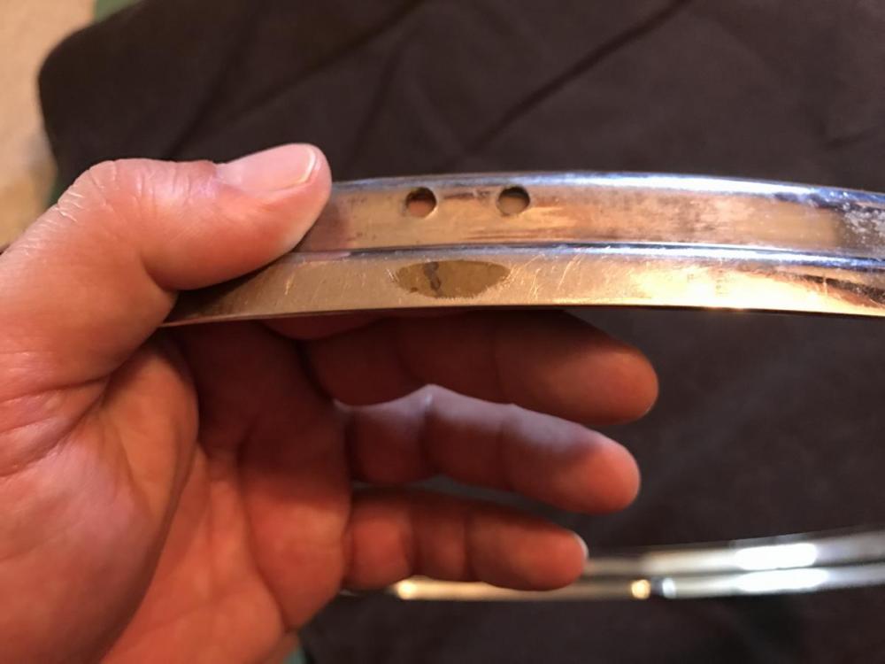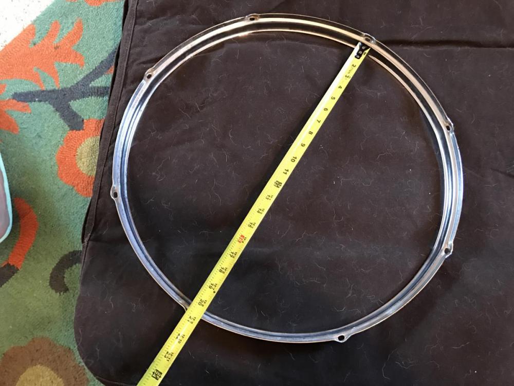 It's a 20" Stick Saver style hoop with two holes to clip in a bracket for a bass drum pedal. A number of people have said that the Jet Outfit was available for order as a 20" although not catalogued, so I'm comfortable calling it that. If anybody has ever fantasized about having a 20" Floor Tom this will also work for that purpose. It's Chrome over Brass as far as I can tell.