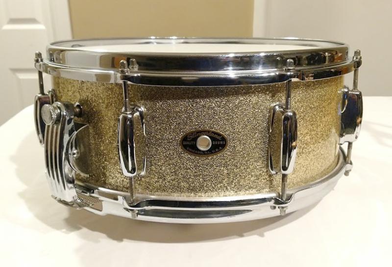 Came across this late 1950's Slingerland silver sparkle "Super Gene Krupa" Model. It has the Radio King solid shell with glue rings. Pretty clean. Has a bit of re-ring separation like most and missing original snare wires. The finish has aged evenly so looks more like champagne in a glass instead of the brighter silver sparkle.