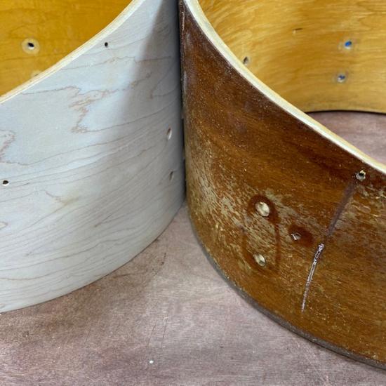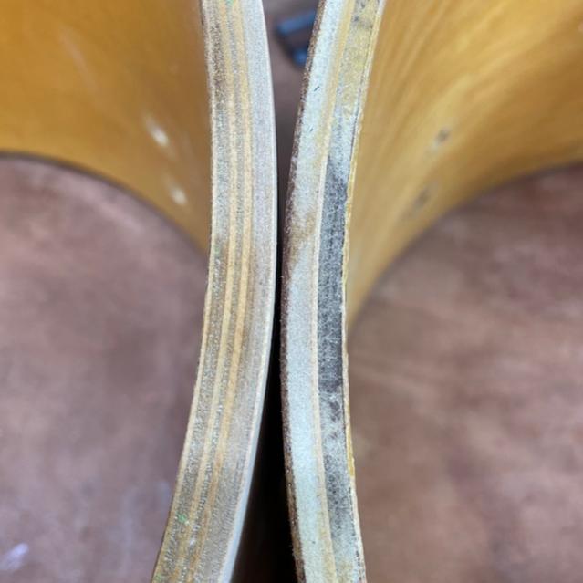 Good thing I decided to paint them: the 14” has mahogany outer ply! In fact, the 10 and 12 are both 5-ply with Maple outer ply, the 13 is 10-ply with maple outer ply, and the 14 is 5-ply with mahogany outer ply. I think it was near the end of Slingerland in Chicago.