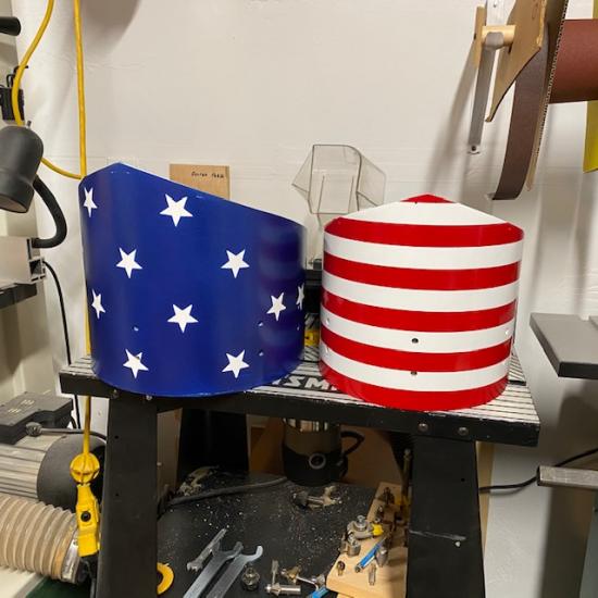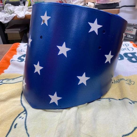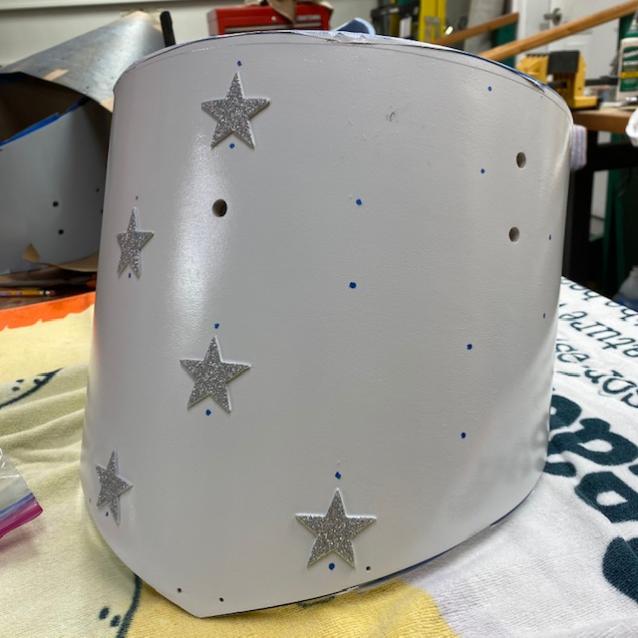 I tried to locate a nice stencil to evenly place stars on the drum, but no such luck. I bought some stick-on stars, but then I needed to figure out a way to evenly space them. I made a template out of kraft paper and mapped out the best spots for the stars. Then, using a nail set, I punched out small holes 1/8” above where I want the top of each star to be. I also punched out a hole directly below the star to make sure I placed each star straight. After painting the base coat of white, I will wrap the template around the drum, tape it in place, and spray a light coat of blue. I’ll locate the stars via the pairs of blue dots and stick the stars to the drum. I’ll paint the drum blue and hopefully remove the stars to reveal white stars.