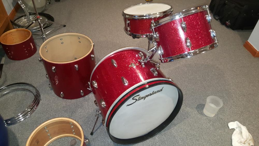 Hi. I wanted to get the experts opinion on identifying my old Slingerland kit. You guys have already helped "guesstimate" the year, 1967, maybe early '68. My question is: would anyone know what this set would have been called, or referred to as. I have looked at vintage Slingerland catalogs, and can't find any descriptions of my sizes. I believe it was a set, because the serial numbers are close, 8x12 (#170319),16x16 FT (#181201), 14x20 BD (#170113). I don't have the original snare drum. Back in the mid 60s, could you have purchased a set, and "upgraded" the FT to a 16", from the 14"? I can't find any "sets" that have my exact sizes. This is the black/gold badge, the bass drum has the off set consolette rail. Any info would be greatly appreciated!!