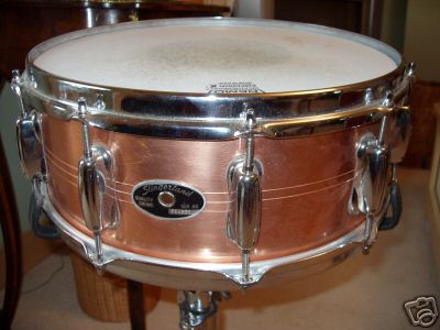 It is a slingerland copper 10 lug snare in a "champagne" finish with an oval black badge(with silver writing). The badge says