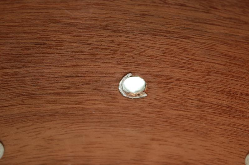 If the '56-'59 'Looped S' badge is legit, it's been removed, substituted, or original re-set with the original aluminum grommet. I took it too a cabiniteer (like that one? Cool Dude) and he confirmed mahogany/poplar/mahogany), and was pretty sure the finish had been varnished or lacquered (and a pretty fair job done, too), which would explain the badge removal and re-setting.