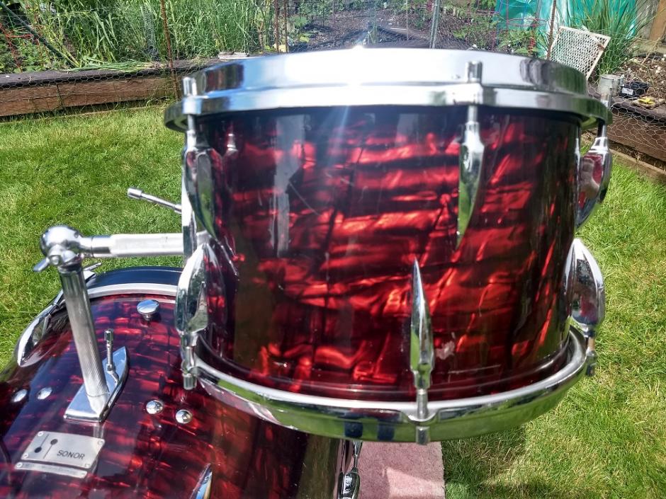 Both tom arm tighteners are Sonor tension rods instead of original T handle pieces.