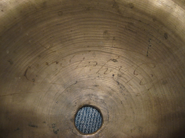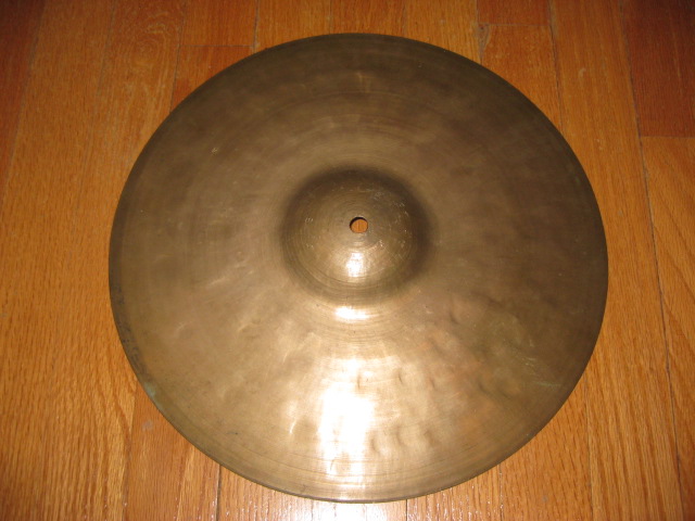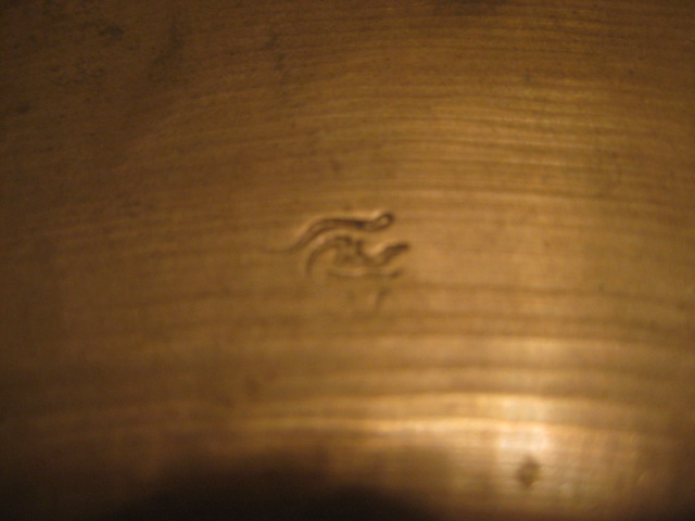 I've had this cymbal for lord knows how long. It's a 14 incher (13 11/16" to be precise). It seems pretty heavy for it's size (don't ask me about gram weight). Looks to have hammering on the top and bottom. Hole diameter is 7/16". There is only one symbol on the top and I have a pic of it below.