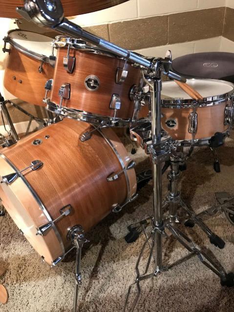 If I were going to get a modern set right now it would probably be either a Gretsch USA Custom (although maybe a Broadkaster) or a Ludwig Legacy (in the new Mod Orange). Either is a modern take on vintage style drums. (Un)fortunately I can't afford either but I have PLENTY of drums already. I do have a couple of newer sets though. One is a Gretsch Renown in bop sizes which I redid the cosmetics on, among other things putting on Round Badges. The other is a Ludwig Classic Maple Downbeat sized set in the "Salesman" striped wrap. On that set as well I retro-ized it by adding a rail mount and shell mounted cymbal holder. So even when I get new stuff I try to make it more like the old stuff I generally prefer and I would likely order (or modify) the aforementioned modern sets in a similar fashion if I could afford either of them (I do like having the modern spurs on both these sets though).