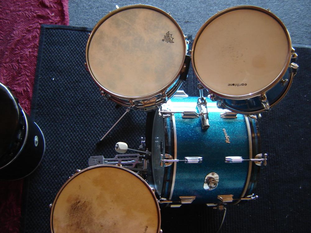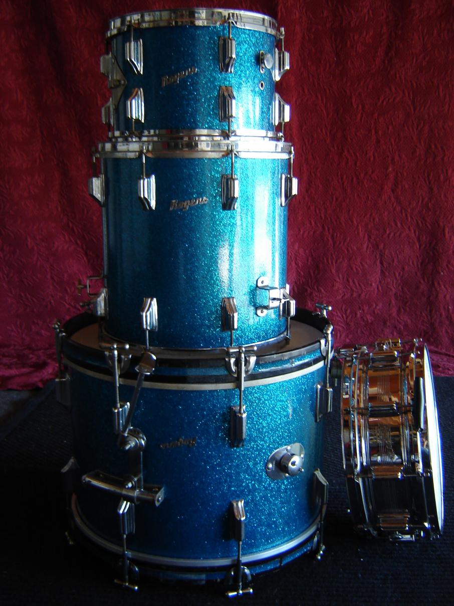 Bought this Rogers kit used in 1974. 20-12-14 Great sounding jazz kit - I'm using earthtone batter heads. I love the deep blue sparkle sheen in low lighting conditions.