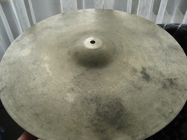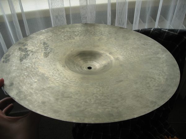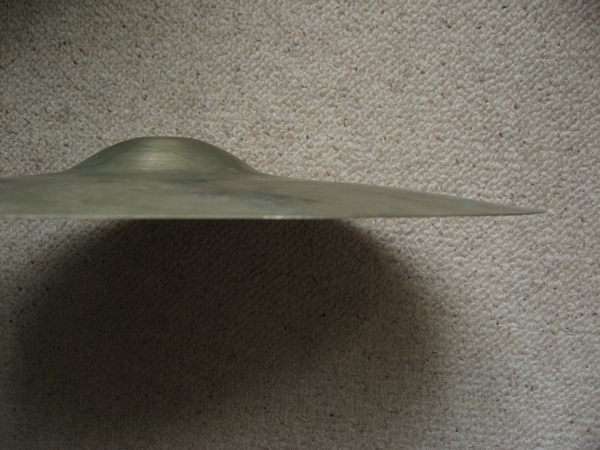 The sound is very simple - loud, unnerving screech. Not much of that initial crash explosion, if you know what I mean, practically immediate still tone. The bell is somewhat muffled, sounds almost like cowbell. When struck by hand, the cymbal gives a trashy, china-like sound. I think all these sound characteristics come from the unusual taper. I suppose I could mellow the sound and shorten the sustain by few rivets, but I don't want to drill this rare (if not very precious) cymbal.