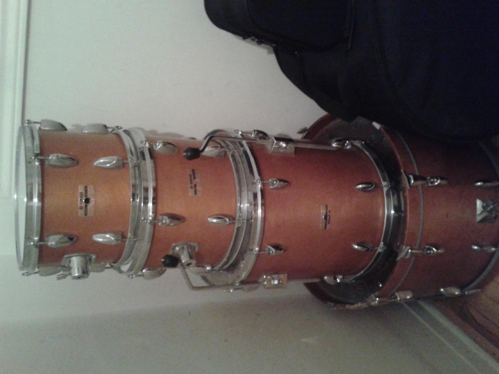 Just got these beauties for a very good price. I was dealing with a 17 yr old the whole time ! Lol ! Good kid and very polite..Went and pick them up with my brother yesterday as he was my transport..So spent the afternoon with my bro who i don't see often, and made a great purchase.. Although there are some issues with the bass drum, (one hoop damaged beyond repair, and both spurs having missing parts and one that wobbles) everything else was in almost perfect condition and working order.. Now here's the very strange but unique thing with these drums.. Both toms have 2 badges ! Yes, two ! I personally have never seen this.. What was the reason for that ? The badge with grommet says made in Japan and has the serial number (which begins with 8) but the other badge has no serial number..Was wondering if you Yamaha experts can hone in on this anomaly, and tell me what year these were made and how many plies on these shells ? From what i've researched from vintagedrumguide.com, they look like the Tour series, birch wood, and are from early 80's ? Here is one pic before i give them a totally clean up. As usual, Any and all other thoughts are appreciated.. My apologies about the pic being sideways. ;) The link shows what looks to be my kit..