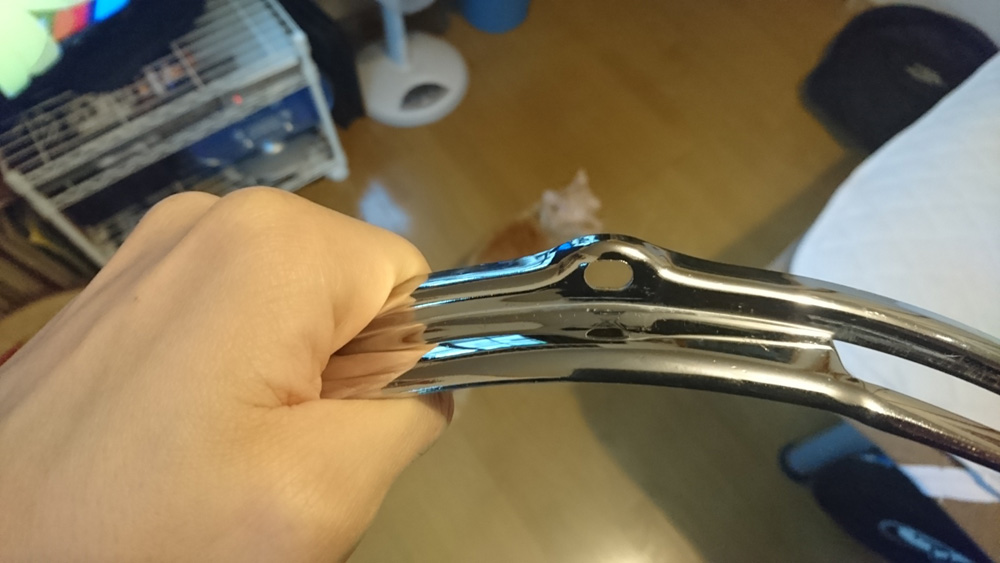 This morning before I left for work I grabbed the hoops and a tape measure to 1, make sure they're flat and in-round. No problems there. And 2, to check the spacing between the holes. As I said, they're for a 14" drum, and the spacing center-to-center between any opposite holes is 37.75cm. I also compared the nearest 14" hoop I had from a different maker (Gretsch), and the spacing there was around 38.25cm. So a half a centimeter difference, give or take. Or a little over 3/16".