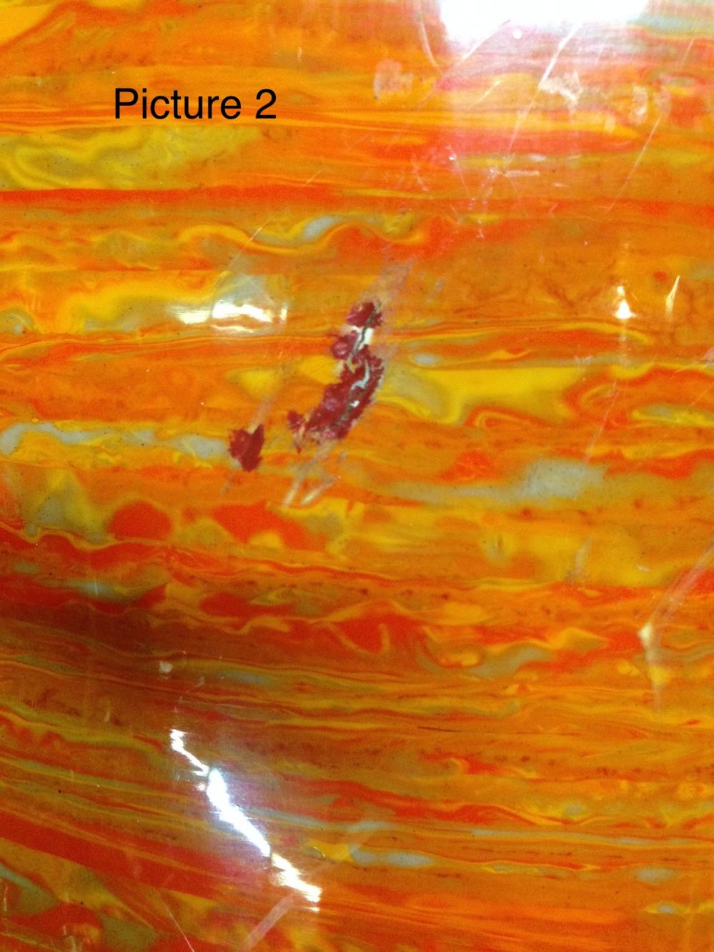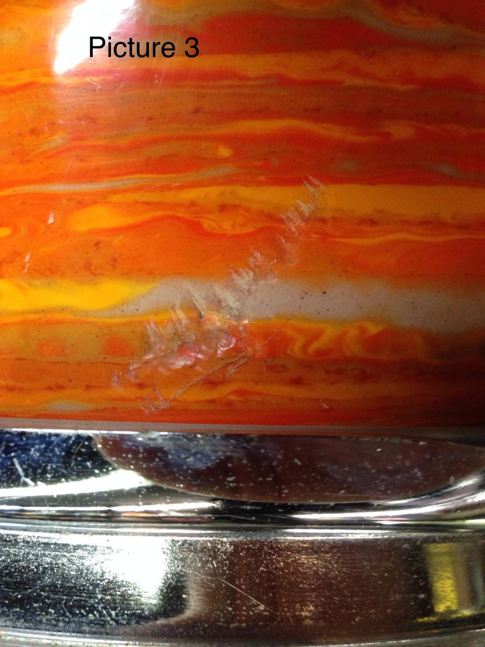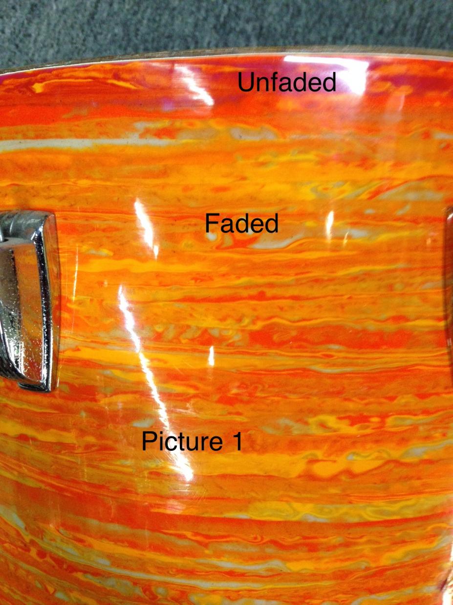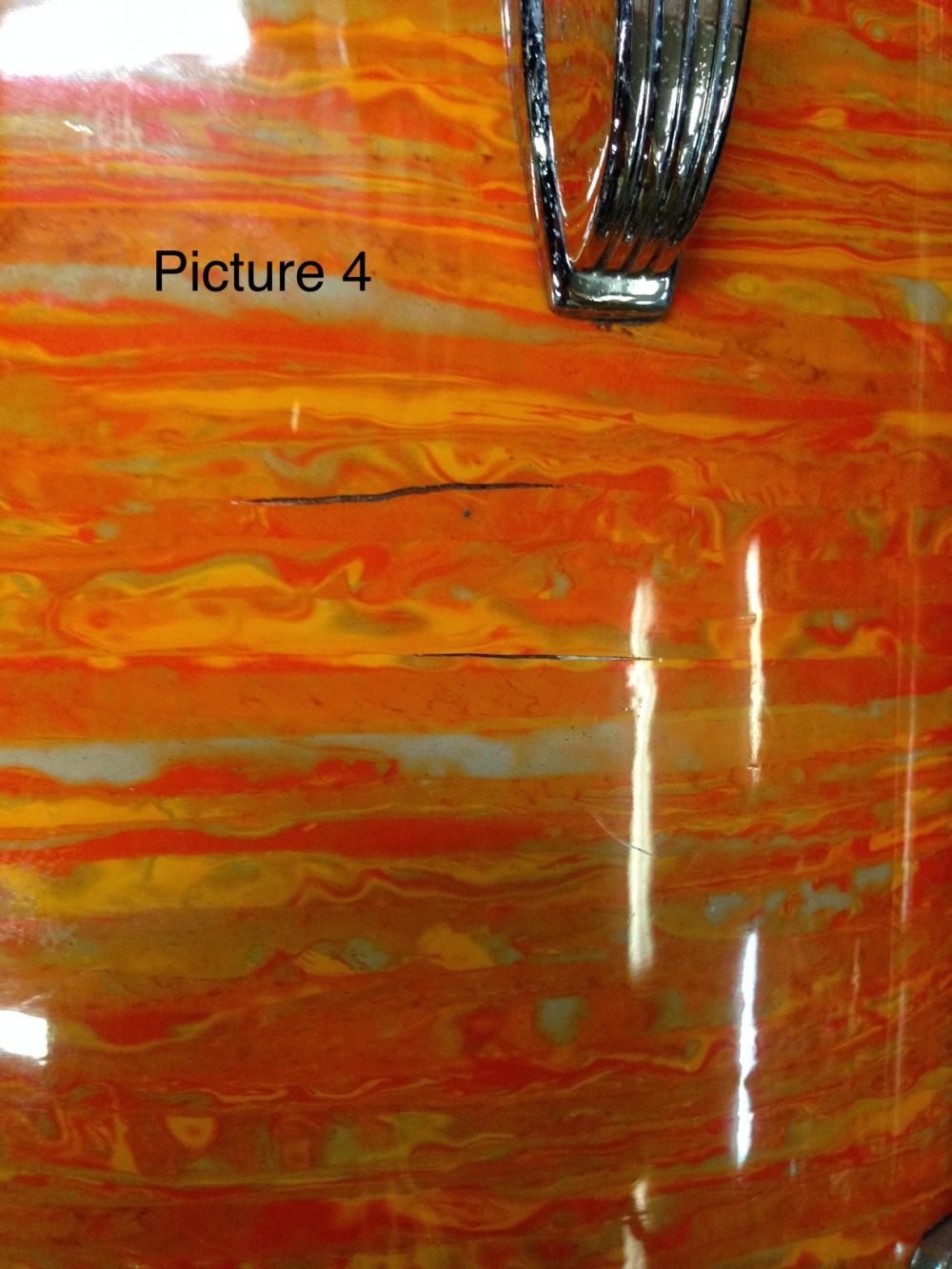 I'm seeking opinions on the value of a 1967, Hollywood configuration, mod orange kit that I'm looking to buy. The kit has some fading, as can be seen in Picture 1. In addition, there are blemishes in the wrap on two of the drums (Pictures 2 and 3), and the FT has a couple of cracks in the wrap that are about a 1.5 to 2 inches each (Picture 4). Also, about 1/3 of the inlay of one of the bass drum hoops is missing (not shown). On the plus side, the kit also includes a 1967 mod orange Pioneer snare (not shown) that is only slightly faded, and easily an 8.5 to 9/10.