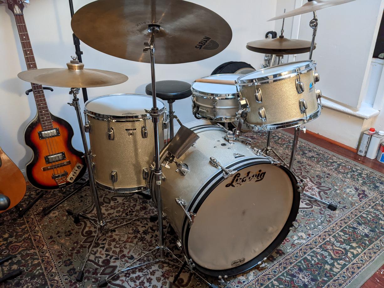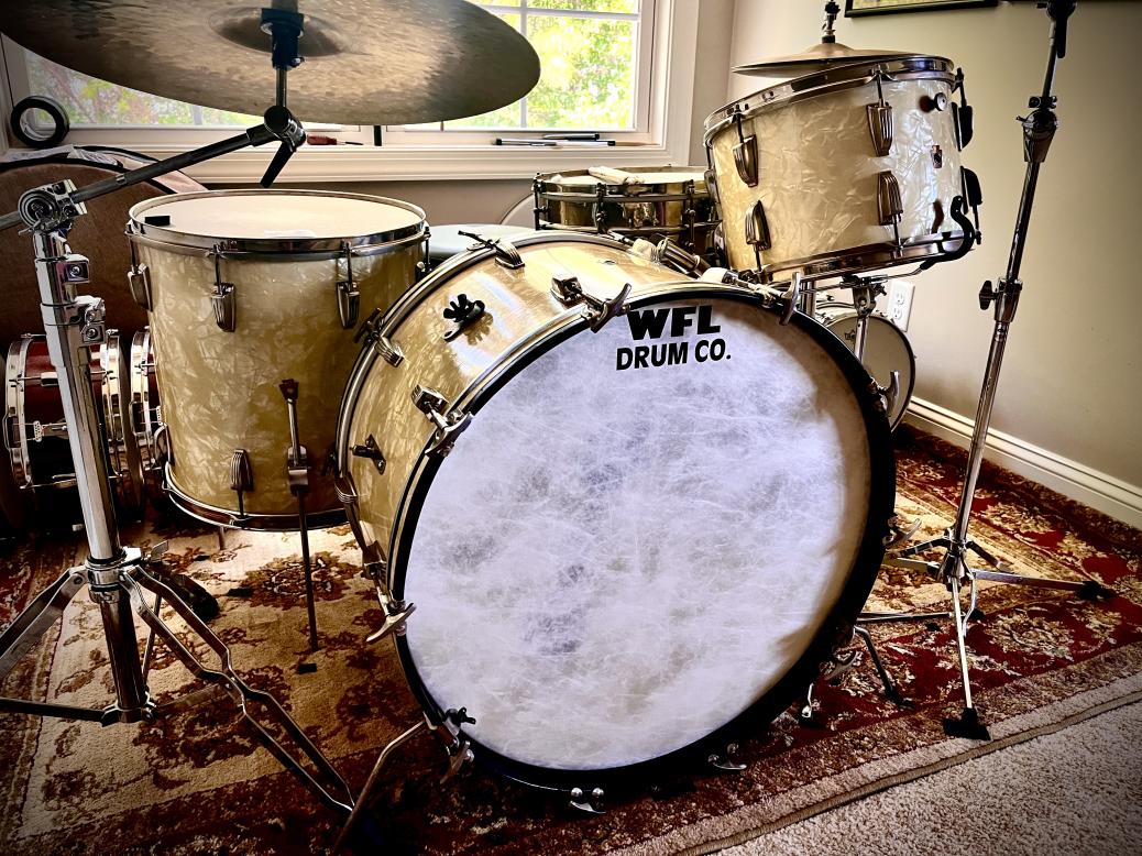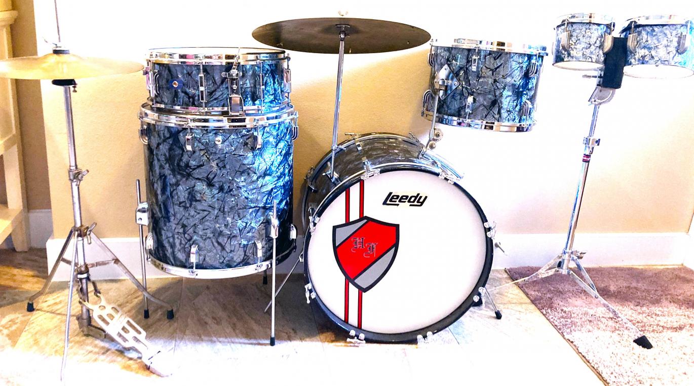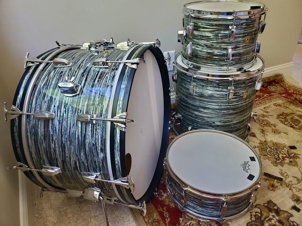 I have downsized my vintage drum set collection down to my forever-keeper drum set. I chose to keep my 1963 Black Diamond Pearl Leedy Shelly Manne set forever. The drums measure 14x20, 16x16, 9x13, and matching 5x14 snare drum. I also kept hi-hat cymbals and a half dozen vintage A Zildjians of various sizes and types. I kept enough vintage pedals, stands, and other go-withs so that I have back-ups for each component. My Ludwig bongos are re-fitted with Leedy lugs that dropped right into the original Ludwig lug mounting holes. Let's see and read the detail of your ONE forever-keeper drum set.