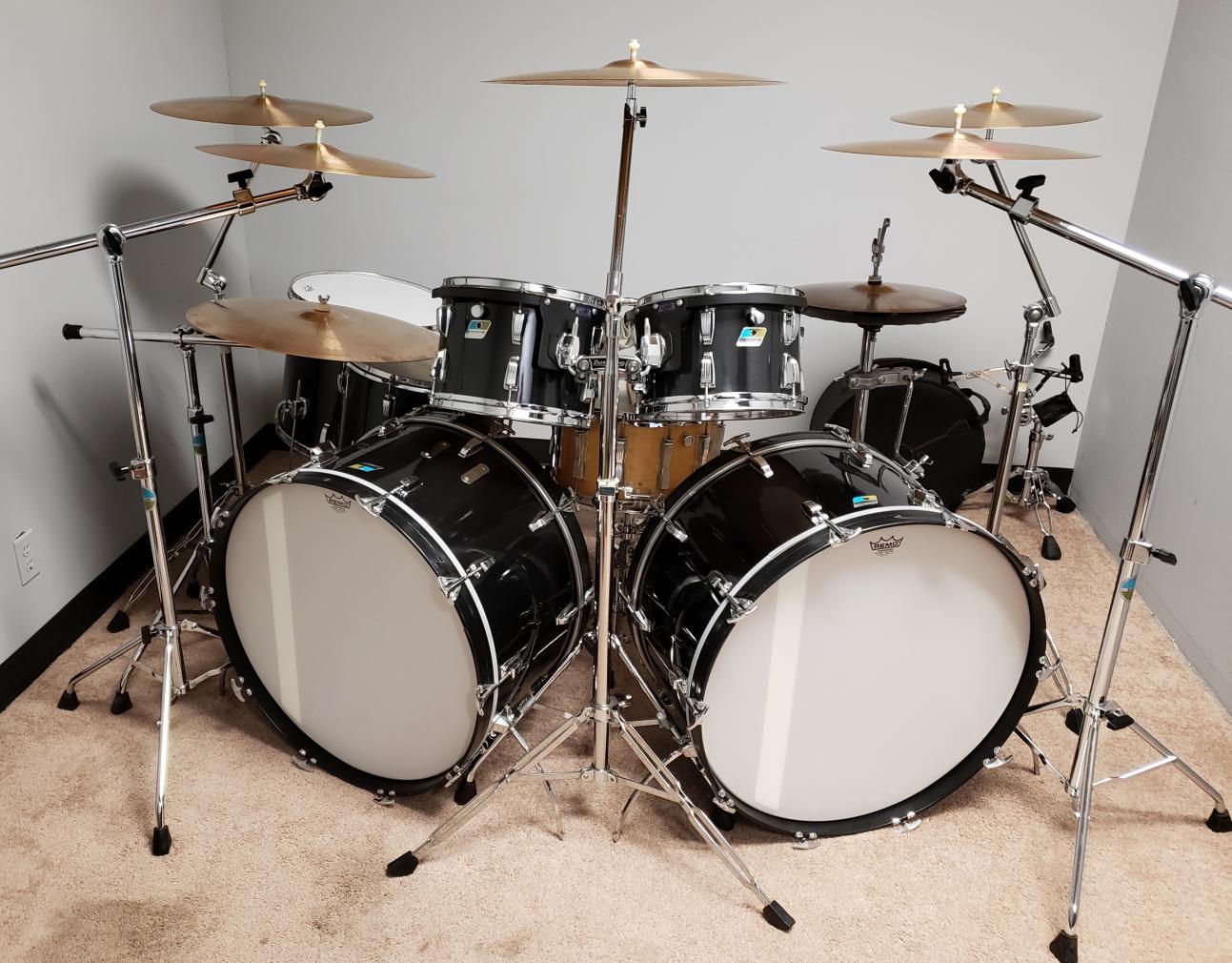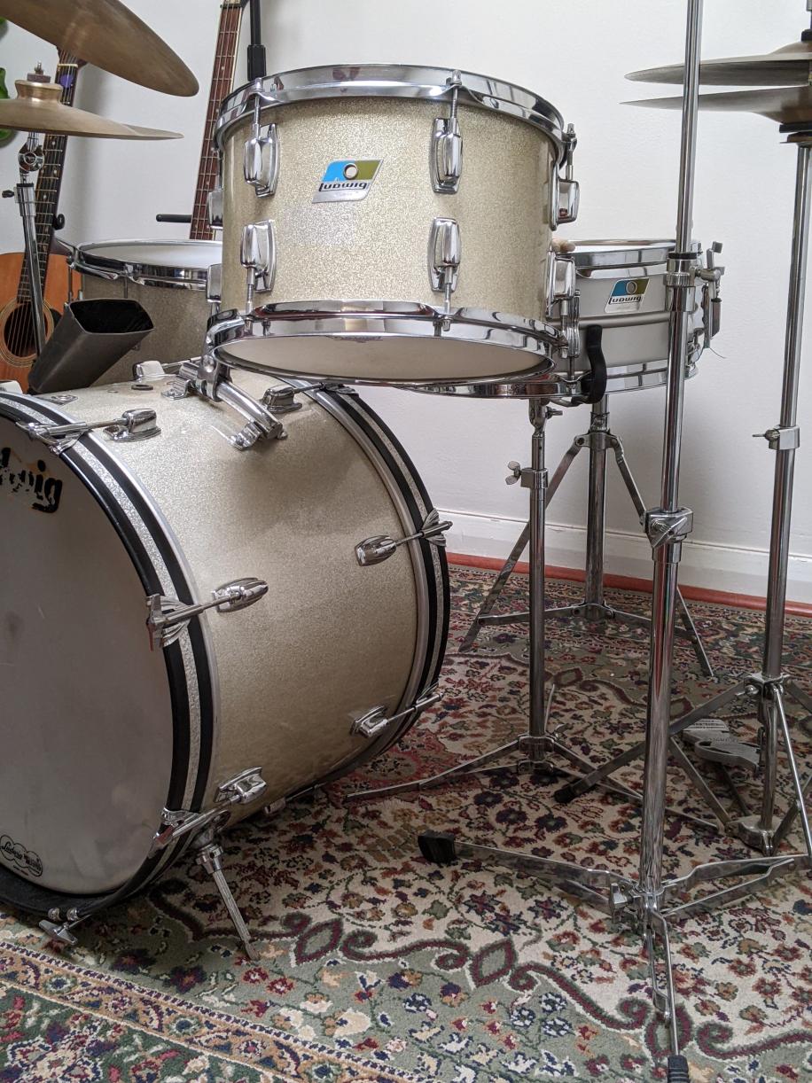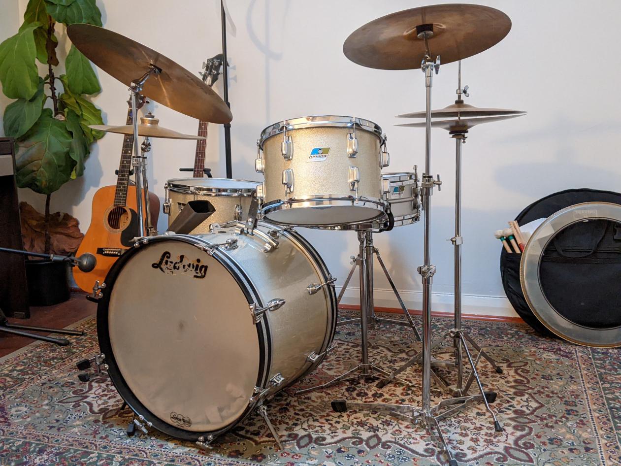 I have downsized my vintage drum set collection down to my forever-keeper drum set. I chose to keep my 1963 Black Diamond Pearl Leedy Shelly Manne set forever. The drums measure 14x20, 16x16, 9x13, and matching 5x14 snare drum. I also kept hi-hat cymbals and a half dozen vintage A Zildjians of various sizes and types. I kept enough vintage pedals, stands, and other go-withs so that I have back-ups for each component. My Ludwig bongos are re-fitted with Leedy lugs that dropped right into the original Ludwig lug mounting holes. Let's see and read the detail of your ONE forever-keeper drum set.