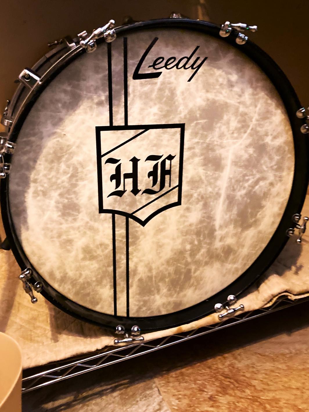 add on text and picture...I decided that I like the monogrammed Fibreskin head look and logo more for this forever-keeper drum set. So, I ordered a replica Leedy logo to apply to the head. I think that it looks classier and more period-correct than the head in the picture of the full set. Waddaya think?