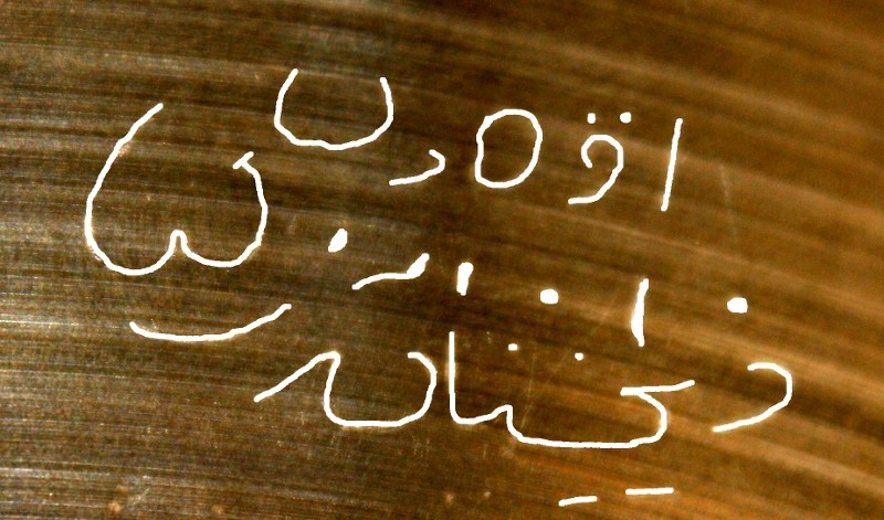 The Arabic script is petty good in photo3 of my original post. I added some contrast to the photo here Also I took the liberty of trying to past over the script with the paint tool in gimp. You can have a look at the attachment. I have also attached a photo of what the whole cymbal looks like.The cymbal sounds like a splash. it's diameter is 26cm so the radius is 13cm. [Attachment: 39765][Attachment: 39766]