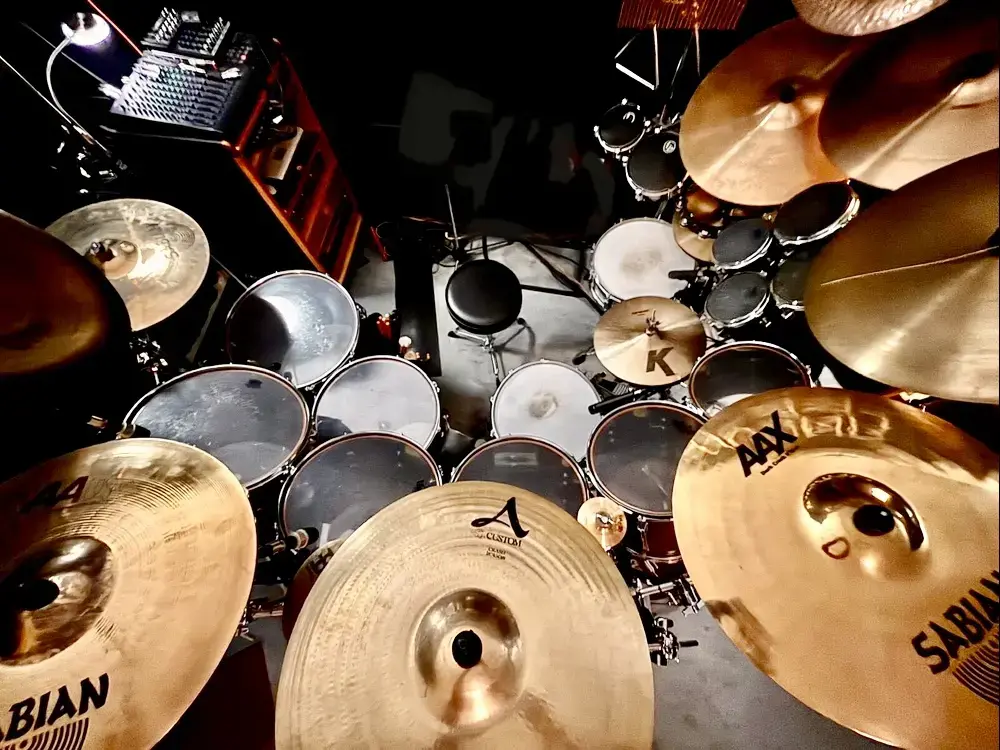 2 x 24" BD; 10", 12", 13", 14", 15" TT; 16" & 18" FT, 6,5"x14" Wood & 5"x14" Snares - and lots of other things to hit, as you can see. 😄