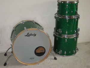 Up for sale is a really rare find. A vintage, maple Ludwig kit, re-wrapped in stunning Green Glass Glitter. It looks incredible under stage lights, and the sizes of this kit make it a great gigging kit for small or large rooms. All drums feature clear interiors, maple reinforcement rings, and tune with ease. Again, this is a fantastic gigging kit.