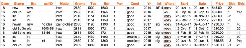 Note that the $2,250 resale of hats in Feb 2018 is probably too high. The sale looked as if something fishy was done off eBay. The median expected price is about $1200, but that's not taking into account a price premium for Old Stamps (if one exists for 16" hats). I've documented the price premium for Old Stamps in other diameters, but I haven't got enough data for hats to get a good estimate. In my data under bids I code -1 for a BIN (which this latest sale happened to be) and -3 for an auction which is pulled for some reason.