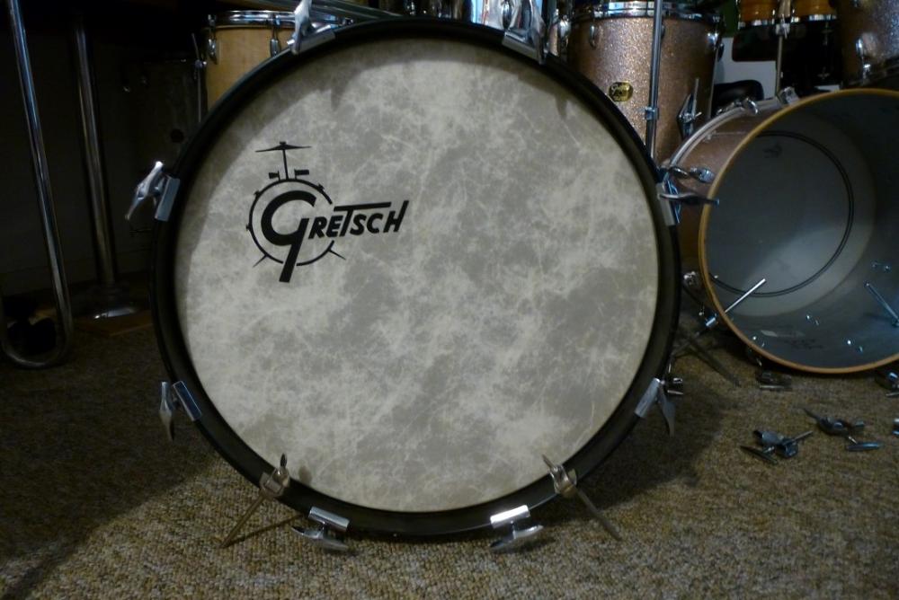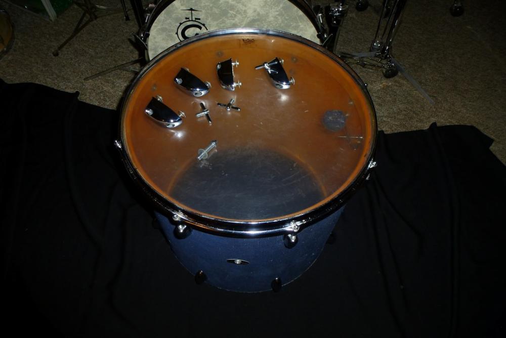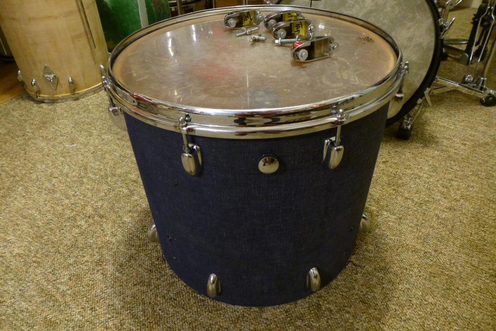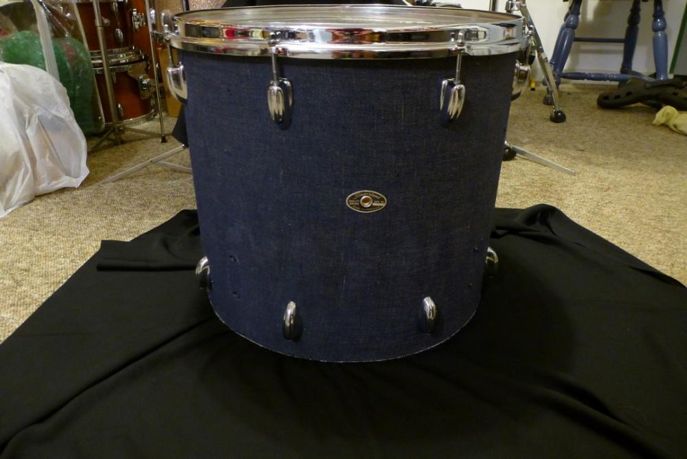 I picked this 18" Slingerland tom up a while back. It came without the bottom hoop. I understand that when it was bought new it could be easily switched over to a bass drum with a few extra pieces of hardware. I don't know if anyone is looking for one of these relatively scarce Slingerland Denim wrapped drums. If so, I'd be willing to sell it. If not I'm thinking of cutting it down to 10-12" and making it into a bass drum with nice wooded hoops - refinishing the drum of course. I have a modern Gretsch 18"x14" bass drum (my Champagne Sparkle kit) and I like the idea of the 10 or 12" deep bd too.
