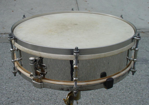 The drums were in very good shape given the fact that they are pushing 100, (we should all hope to look this good at 100 yrs. old!). I used Simple Green to clean the years of schmutz that accumulated on the shells and hardware. All of you know that I constantly preach: "rust does not sleep"...so any rust was handled by my trusty Dremel tool, soft steel brushes and 0000 steel wool (note to the Purists: don't get your undies in a bunch, no damage was done to the hardware with the 0000 steel wool). The 4x14 came to me missing the top rim so I had to have one fabricated. My machinist Abe Abello came through once again, notice how he nailed the "ears". If I hadn't pointed this out to you the top rim would have passed easily, that's how good Abe is! A thanks also goes to Les and Brian at Avenue Plating for the nickel plating.