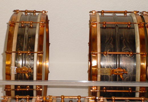 As most of you know I like to collect "sets" of snares and this one completes another set. From what I am told 10 lug/scroll DeLuxes are somewhat transitional and rare in that they are in between the 8 lug scroll era models and the 10 lug 12 pt. floral era models. This drum is in great shape, all original and will need only a basic cleaning. I wanted to share the photos with you now as the restoration may be a week or three away because next week is the Chicago Show. The drum came from Ned at Vintage Drum Center. We had been working on this deal for close to a year, deals with Ned can take a while but we finally worked it out so all is good. The enclosed photos show the 4x15, 5x15, 6.5x15 8 lug scroll DeLuxes, the 4x15, 5x15, 6.5x15 10 lug floral DeLuxes and the 4x15, 6.5x15 10 lug scroll DeLuxes with the space ready to add in the 5x15. My goal as a collector is to find every size/model DeLuxe/Black Beauty that was made. I'm still in search of the following DeLuxes/Black Beauties and one early L&L: 1. 6.5x15 6 lug 1911-12 Standard, 2. 6.5x14 6 lug scroll, 3. 6.5x15 6 lug scroll, 4. 5x15 Super-Ludwig...you know where I am.