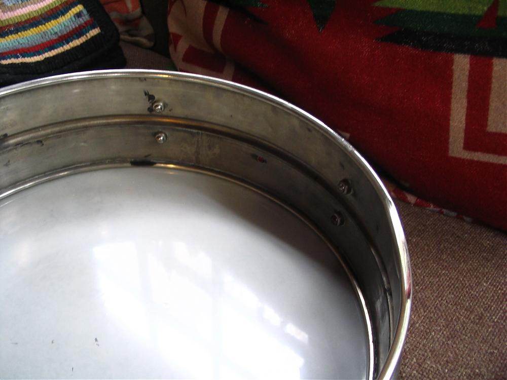 Here is a drum I got yesterday off CL for $75. There are no identifying marks anywhere. I think it is Ludwig. Heavy 2 piece brass shell and the edge flanges fold back to the shell and are soldered. The only strange thing is the width of the edge flange. It is only about 3/16" wide. I have a couple of other 20s Ludwigs and the edge seems wider on those. No throw at all. probably had a hoop mounted one. No holes in the shell for one either. What Ludwig throw would be correct? I'm going to mount a throw on the shell so I can play it. Has anyone seen these kind of edges on other Luddys? Will post pics when I'm done fixing it up.