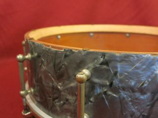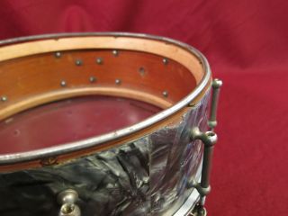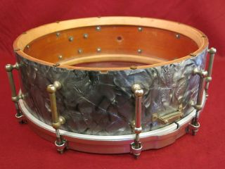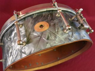 Here is a quite unique drum - 1920s Liberty / Slingerland Tone Flange Snare Drum. This drum was essentially Slingerland made but sold through the Liberty Musical Instrument Corporation. The black diamond pearl wrap is in good condition with the only issue being some missing wrap near the batter bearing edge due to the oversize shell. Often, the rings in modern heads are cut to accept this oversize shell characteristic. The wring is included in the sale, however there is no tone flange with the drum. Mike Curotto has had a reproduction run of these in the past made, so they are still available. The clips and rods are also replacements. The drum is quite stunning and has serious mojo! Also - it is still playable without the flange and actually sits modern heads better without it.