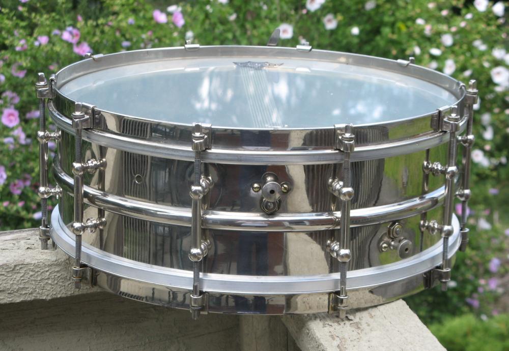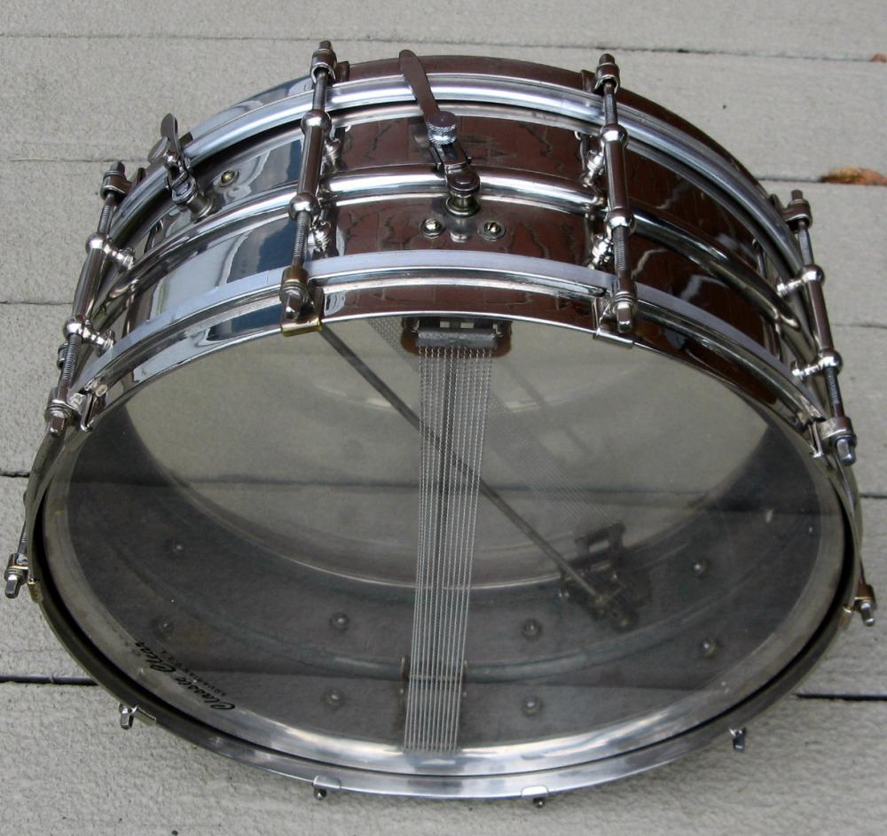 This drum is nearly 99% original. However, the two adjustment knobs for the extension levers are repros (thanks, AK!). Apologies for the modern clear heads but I wanted the inner workings to be visible.