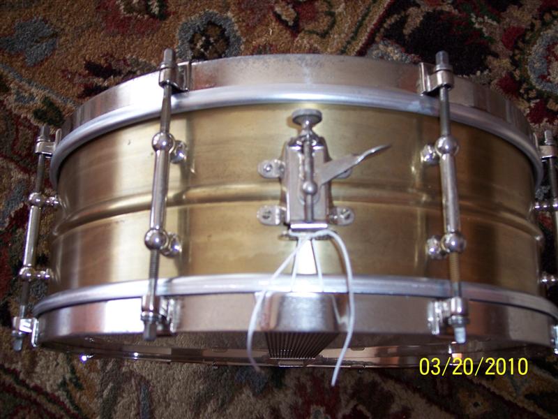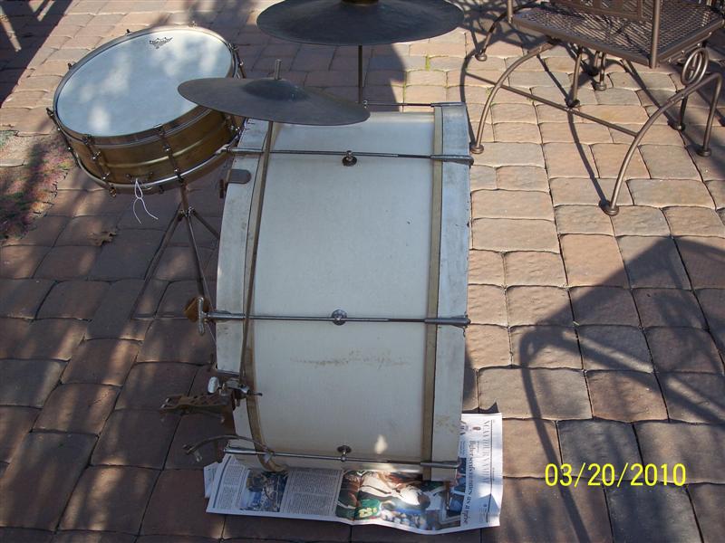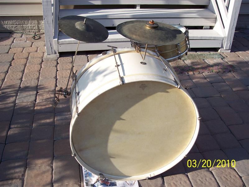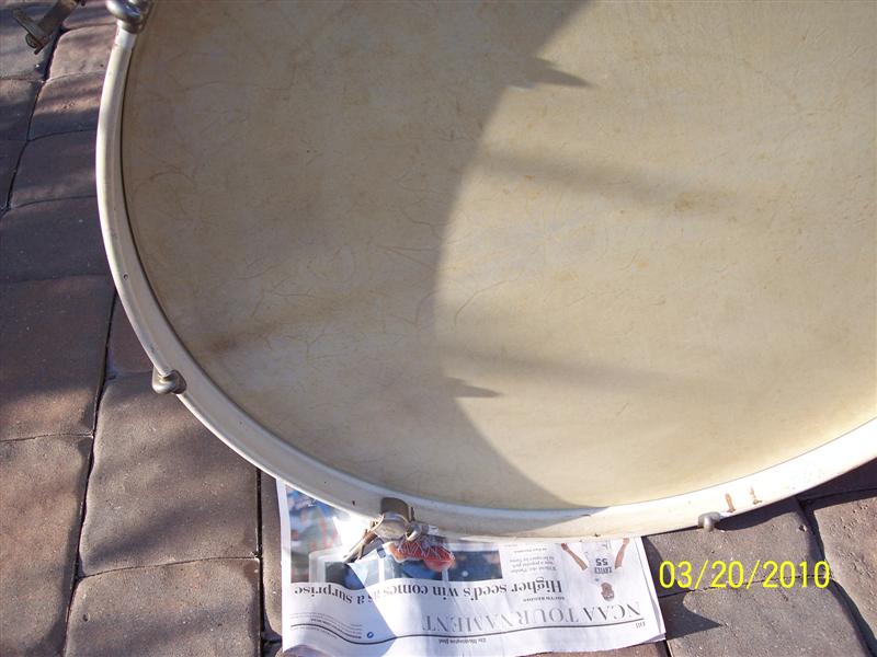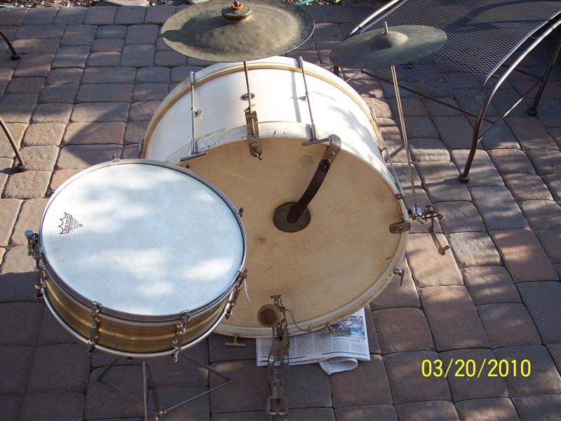 The snare sounds fantastic, and the bass has a really nice tone to it. I believe the bass heads are original. They are Leedy calfskin heads wrapped around wooden hoops. I thought they were metal until I went to clean them the other day. Both of the snare heads were broken and also had wooden hoops. The bass has the cymbal beater that you use to hit a cymbal attached to the hoop.