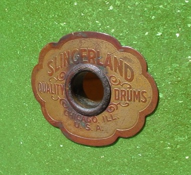 I'll call it Slingerland Artgold but the hardware finish on this snare drum really resembles the Ludwig & Ludwig Classic Gold (brass plating with gold lacquer) finish that L&L used on their early-mid 1930s Black Beauties. There was a lot of Artgold present but an equal amount of age and tarnish. I haven't figured out how to duplicate the Classic Gold finish yet so the decision was to leave the hardware as is and just do a simple cleaning with a light coat of gold lacquer to seal everything to prevent any further tarnishing. The 16 tension rods were not correct so I went to my stash and found the correct tension rods but these had to be brass plated, antiqued and lacquered. Thanks again to Les and Brian Hadnagy of Avenue Plating for the brass plating and antiquing. The threaded snare gates have the letter "A" stamped on the inside (not seen) part of the rim and gates. This is called a "manufacturer's cartouche", thanks to Slingerland expert Dr. Carl Wenk for that information. I'd love to know if those type of markings are under the riveted snare gates, feel free to send photos. The Slingerland Broadcaster engraving on the top rim is pretty faint but it is there. All in all, the "carpet matches the curtains" pretty well on this drum.