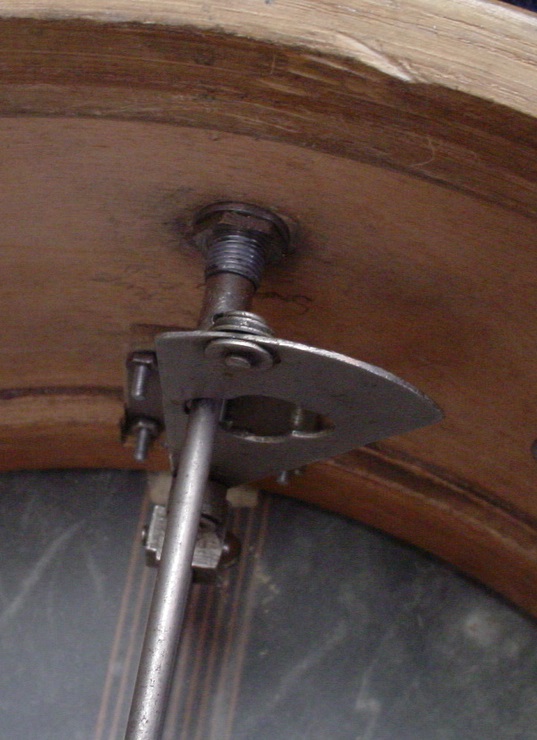The chrome hardware also shows its age and has some light pitting here and there but everything cleaned and polished up nicely except for a few of the slotted tension rods. Internally the top mechanism is just like a Ludwig Super-Sensitive and a Leedy Dual but the internal “parallel” mechanism is quite different. Externally the top linkages are similar to a Leedy Dual. Externally the bottom parallel mechanism is vastly different vs. the Ludwig Super-Sensitive and Leedy Dual models. The shell is drilled for 8 lugs like a Leedy of the same era.