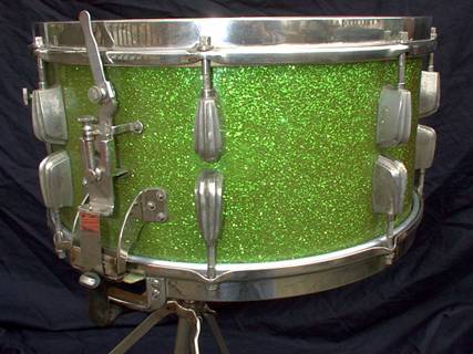 I have the exact snare drum pictured. Green sparkle (though mine is not in nearly as good of shape). My drum is missing the original strainer, and butt plate (with 4 extra holes drilled for the crappy import hardware they used to replace it), but it has the late 30's cloud badge, and the exact same hoops as shown. What I want to know is this:
