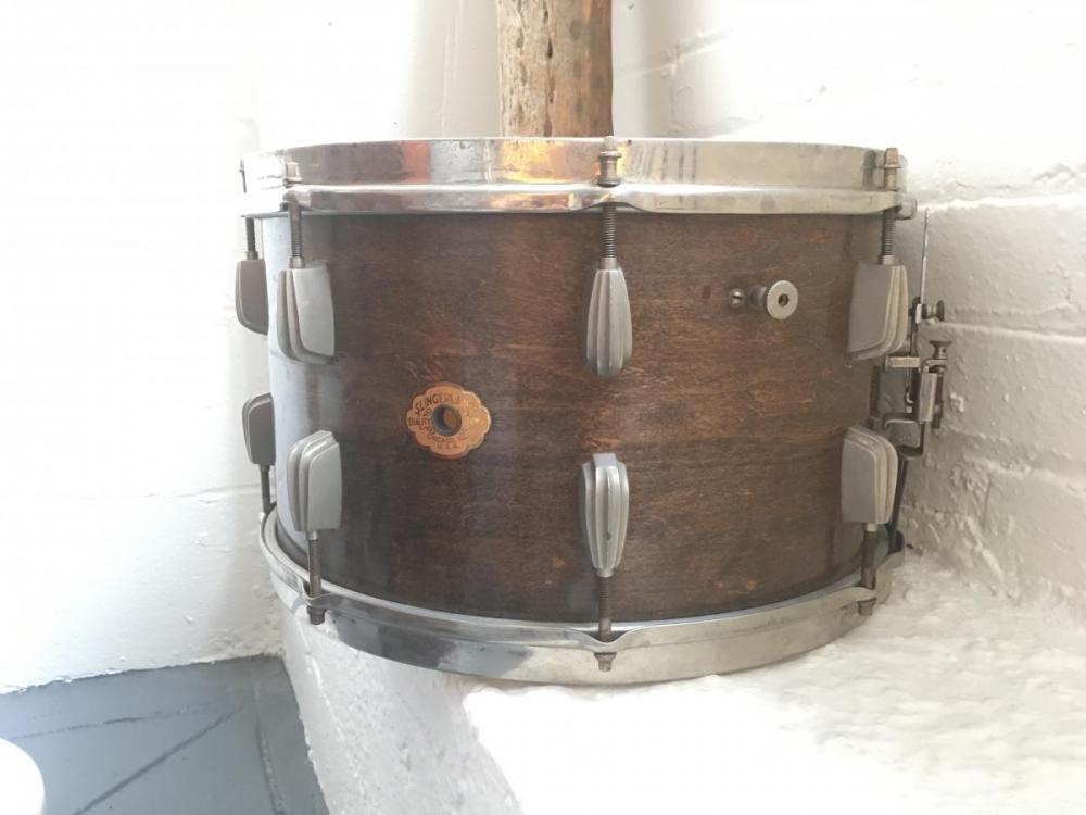 I'm selling my 7x14" Slingerland Radio King Snare Drum. I believe it is a Buddy Rich Artist Model Swingster. It has 16 nickel Beavertail lugs - most of them are okay, a few are slightly cracked and will need to be repaired/replaced. I have the heads completely loosened as I bought the drum a while ago and haven't had the opportunity to play it much or restore it, thus I wanted to relieve pressure from the lugs. The inside of the drum is immaculate, the bearing edges are very nice and it is finished in a walnut stain. I have no idea if this was originally a wrapped or duco drum – there is no evidence to suggest that. My suspicion is that perhaps it was ordered from Slingerland with an "antique" or "lacquer" finish, as advertised in the 1942 catalog. The rims are not stamped with "Radio King" but they do seem to match pictures from period catalogs.
