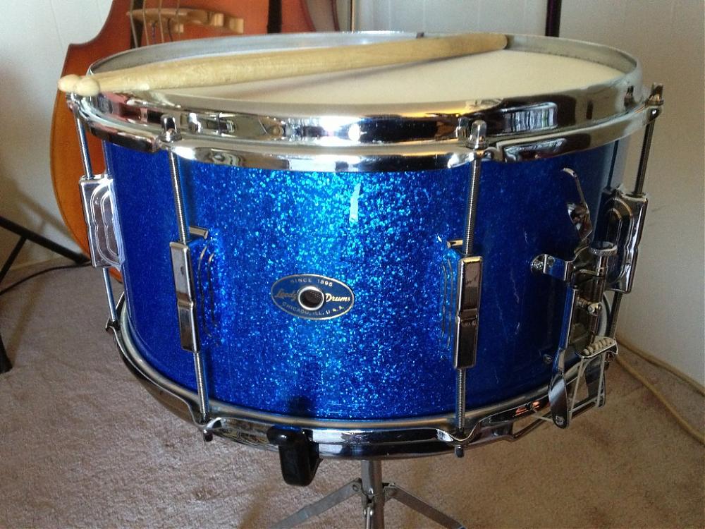 Here is my "Leedy snare that never was". The shell is mid-50's Slingerland 7x14 3-ply student Radio King and the hardware came from a late 50's Leedy snare. The Leedy 3-point strainer bolted on with only 1 hole needing to be drilled...and the Leedy butt plate (with extension) bolted in as is. I had her wrapped in blue sparkle to match my '58 Ludwig kit. Let me tell ya...this is one kick a$$ snare!
