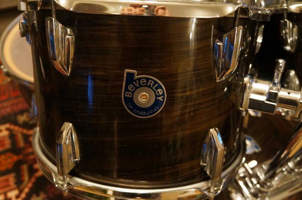 This is a rare late 1960s Beverley Drum Players Kit in 22x14/16x15/13x9/12x8 sizes in Rootbeer Swirl also called Mahogany Duroplast. (The same finish Ringo had on his Premier kit before his Ludwig kit - Beverely was bought by Premier).