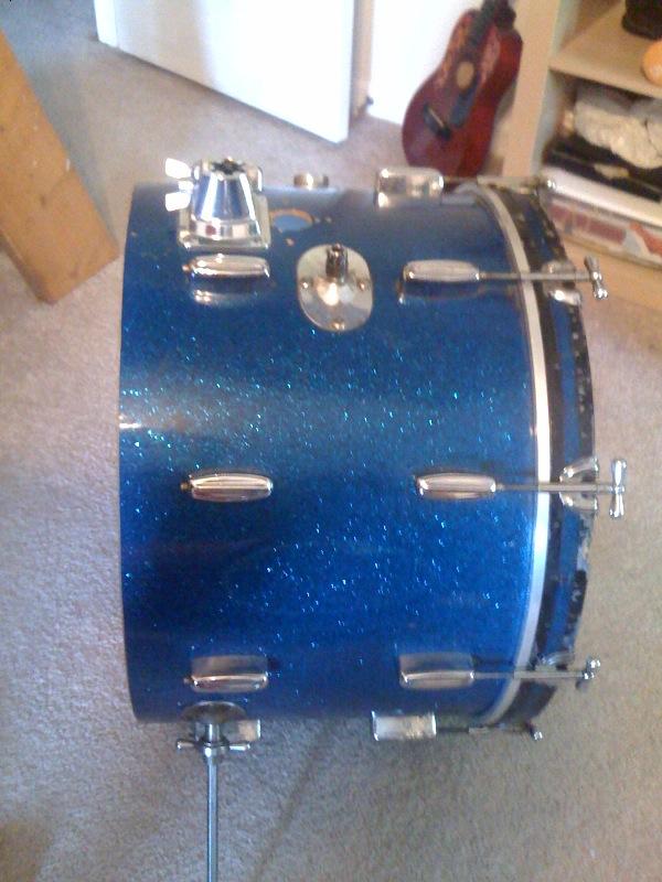 I bought it off a friend who used it in a studio in Nashville. Its a blue sparkle wrap, has one hoop, the Bread and butter lugs, the center cymbal stand, looks like a side tom mount, (someone did put a Yamaha tom mount on it). has the the original legs.