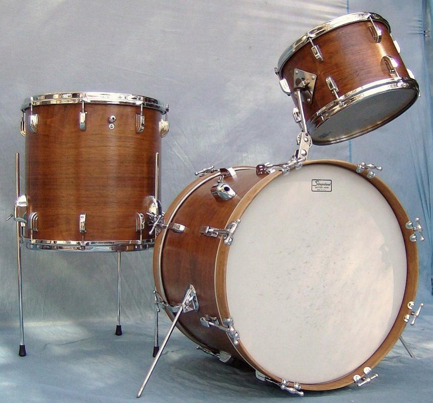 14x18; 14x14; 8x12. Walnut veneer installed by former owner along with the single ply maple BD hoops. Both toms have the 30 degree bearing edges which are not common on these Slngerland era Leedys.
