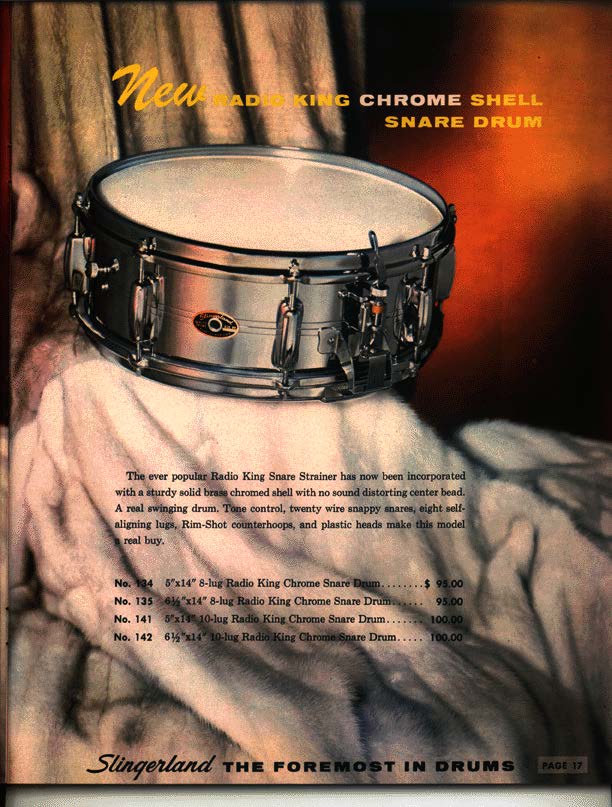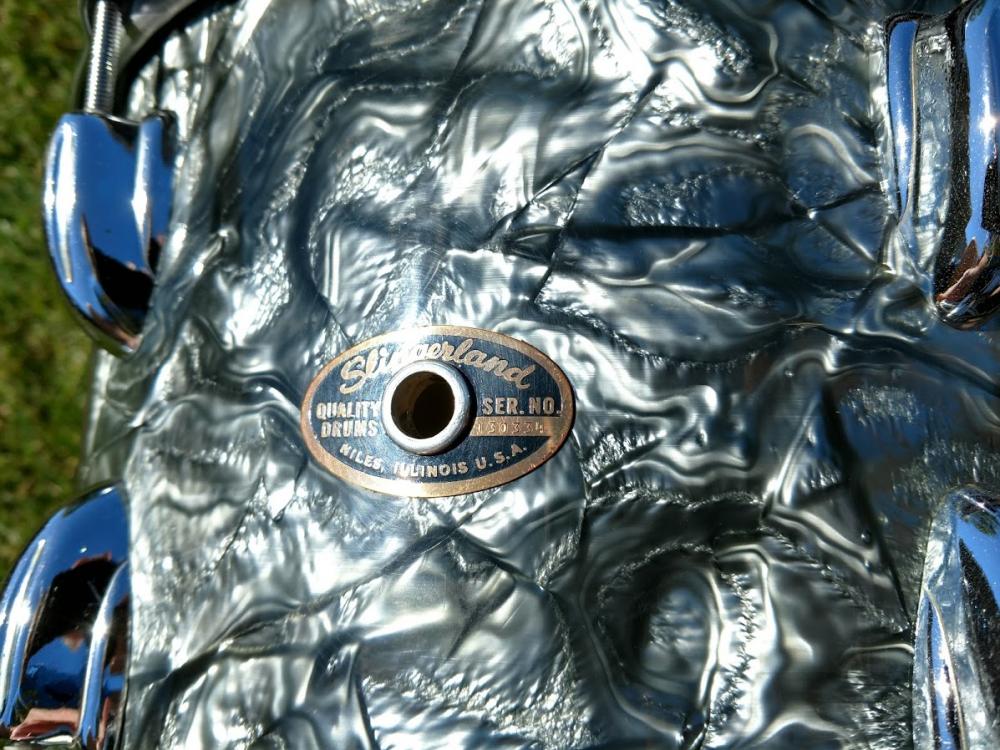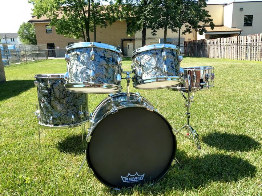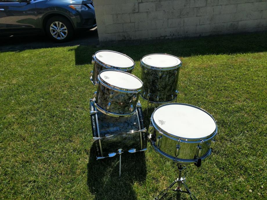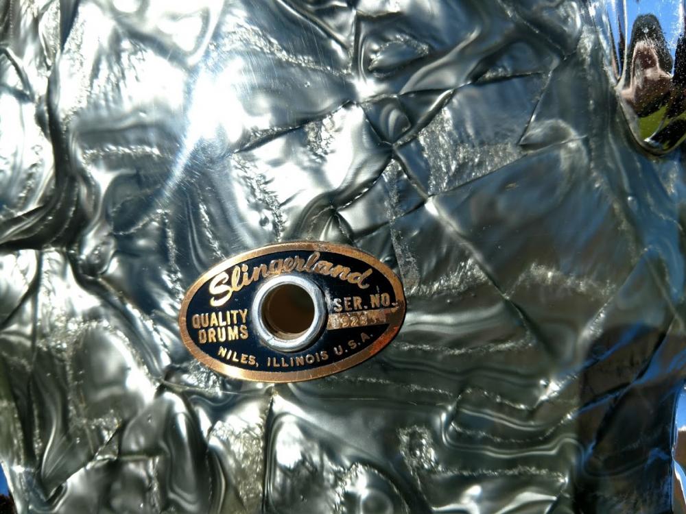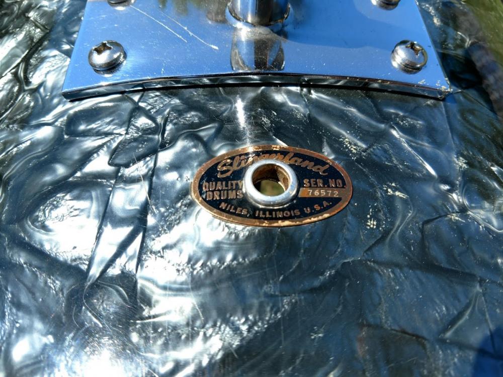 1966 Slingerland “Modern Solo 2R” outfit in Black Diamond Pearl with copper Script badges, 3-ply with chocolate milk interiors. Includes a matching copper script badge 6.5" x 14" Radio King 10 lug COB snare. The difference between this kit and the one in the 1967 catalog photo (couldn’t find a 66 catalog) is that this kit has 8” x 12” and 9” x 13” rack toms, (the catalog lists the two rack toms as 8” x 12”). Only one of the drums interiors is date stamped which is the floor tom. It reads "March 7, 1966".