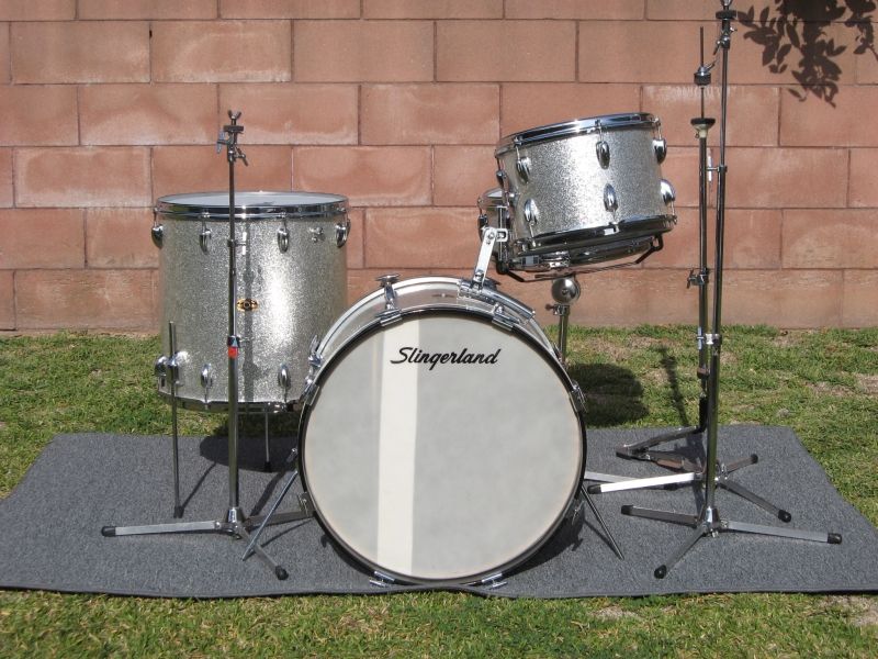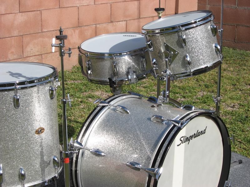 Here's my gorgeous 1967 4pc Slingerland kit in original Sparkling Silver Pearl! The killer snare drum is a steam-bent solid maple Vaughncraft shell, with all the hardware donated from the original Artist snare drum. Yes, I still have that shell...and keeping it! Oh yeah, the rail consolette is from Steve Maxwell. Really looks and works great!