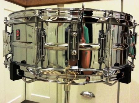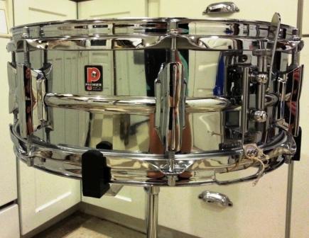 It has a couple small dimples in the aluminum shell and has very little pitting. It looks like it was dropped at least once in it's lifetime, because the throw-off lever is bent, which reduces the travel when you engage the snares. If you give it a good rim shot, the lever disengages. As a quick temporary fix, I used a rubber band between the tension rod to the left and the throw-off arm. It's back at the school right now, so they can use it. Is this common with this type of Primier throw-off? Does anybody have an extra one that is for sale? I don't really want them to need a rubber band to make the drum function correctly.