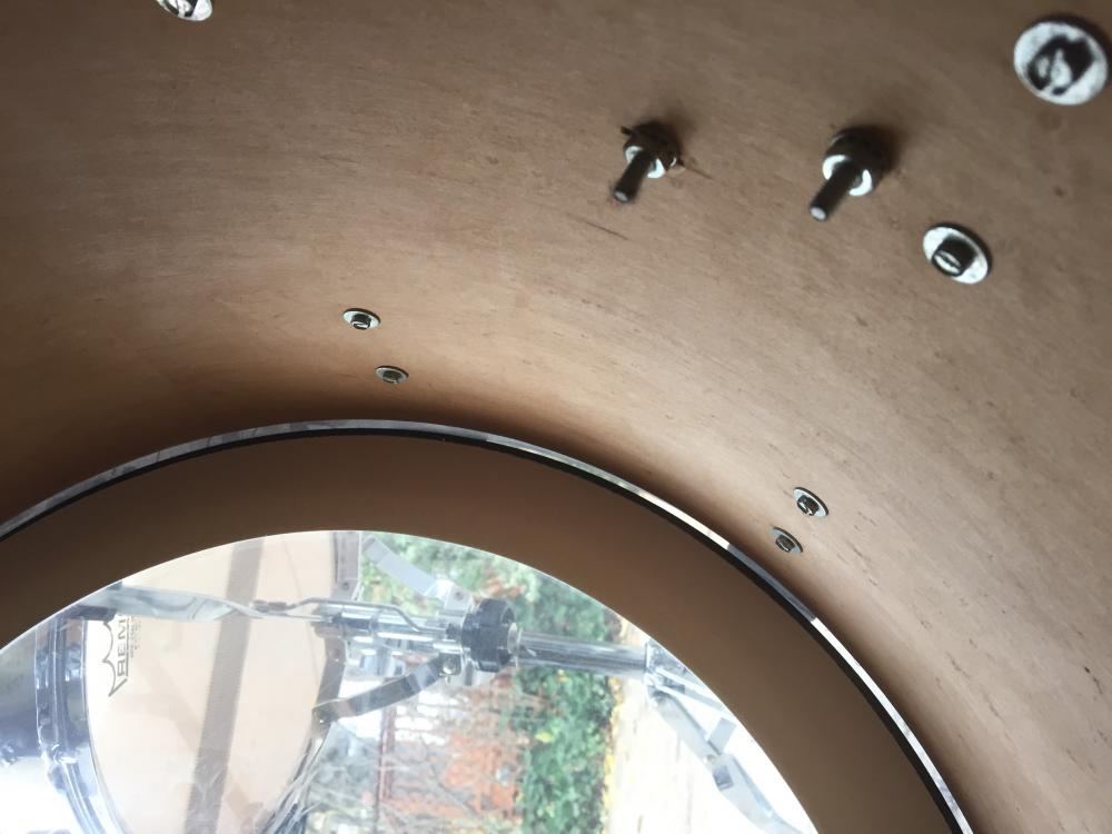 The drums have been gigged and played with for 35 years, so there is some signs of aging. The brushed brass wrap has some scratches and minor rusting on it, but the chrome hardware looks really nice for its age - a few scratches on the lugs near wingnuts, but no pitting. All of the hoops and mounts are original besides one floor tom leg mount (which was professionally replaced with a Ludwig replacement), and one or two wingnuts. Two of the original wingnuts have cracked, but are still very usable. Bearing edges are in great condition & these drums tune up really well.