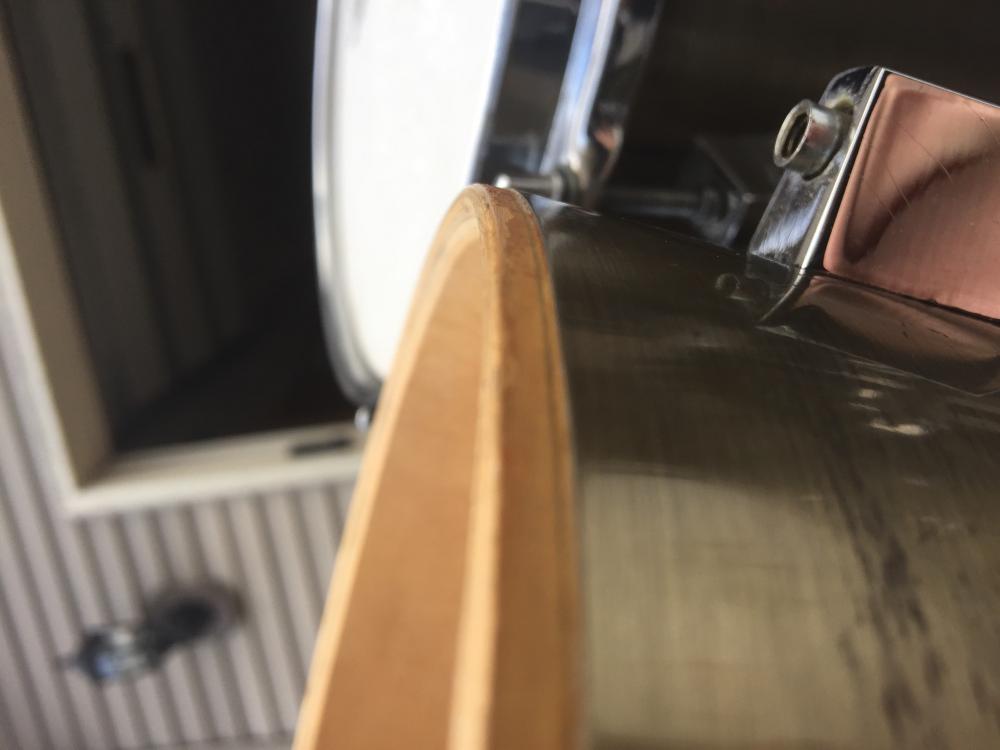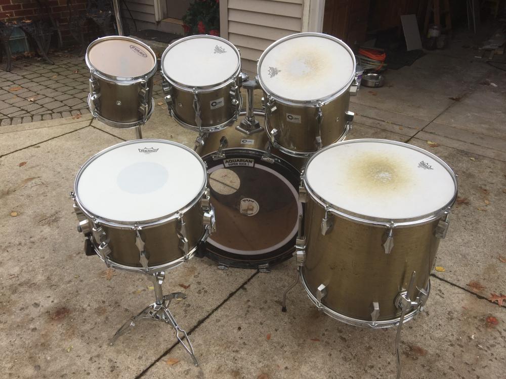 The drums have been gigged and played with for 35 years, so there is some signs of aging. The brushed brass wrap has some scratches and minor rusting on it, but the chrome hardware looks really nice for its age - a few scratches on the lugs near wingnuts, but no pitting. All of the hoops and mounts are original besides one floor tom leg mount (which was professionally replaced with a Ludwig replacement), and one or two wingnuts. Two of the original wingnuts have cracked, but are still very usable. Bearing edges are in great condition & these drums tune up really well.