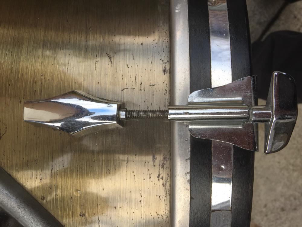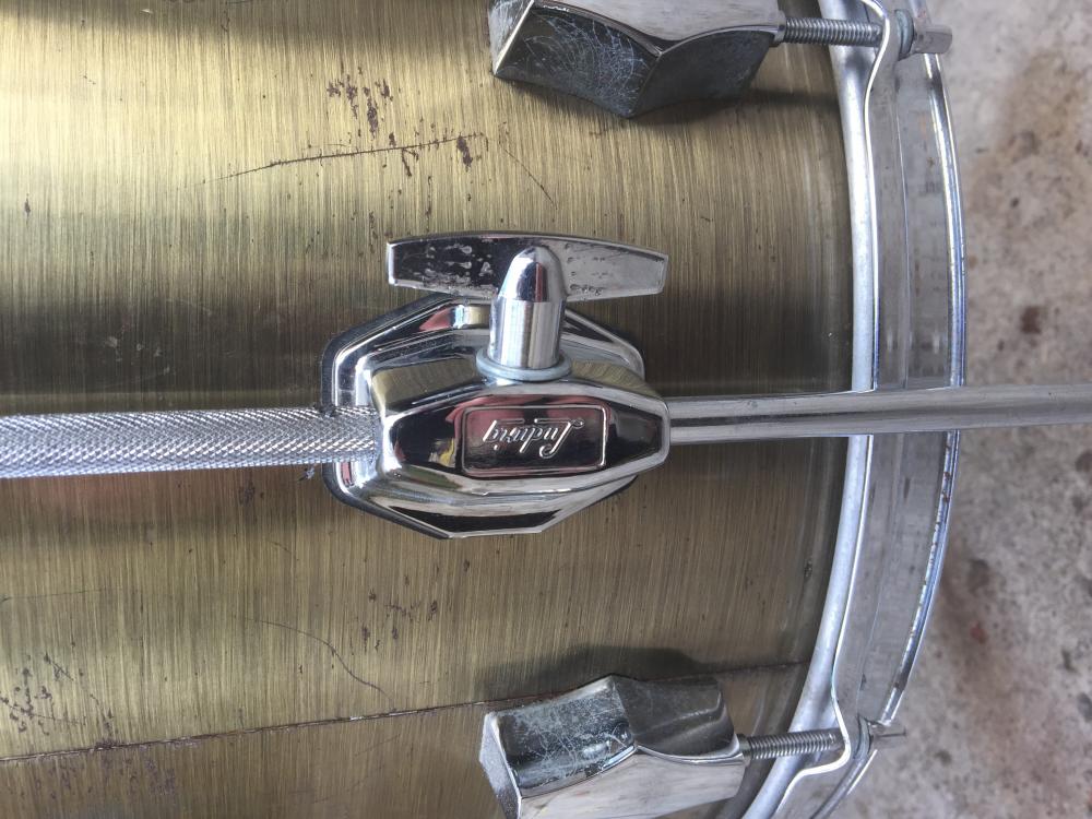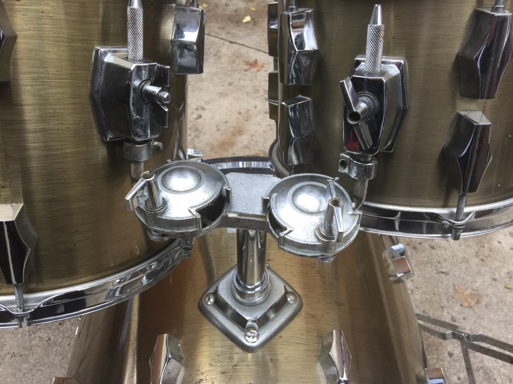 The drums have been gigged and played with for 35 years, so there is some signs of aging. The brushed brass wrap has some scratches and minor rusting on it, but the chrome hardware looks really nice for its age. All of the hoops and mounts are original besides one floor tom leg mount (which was professionally replaced with a Ludwig replacement), and one or two wingnuts. Two of the original wingnuts have cracked, but are still very usable. Bearing edges are in great condition & these drums tune up really well.