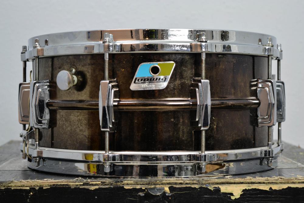 Early 1980s Ludwig 6.5x14 Black Beauty. Diecast hoops top and bottom, a couple different tension rods. Shell has patina'd nicely - has a bit of black nickel loss throughout. Drum sounds absolutely wonderful - the heavy, spun brass shell has a really nice balance of depth, resonance, and volume.