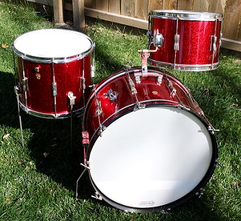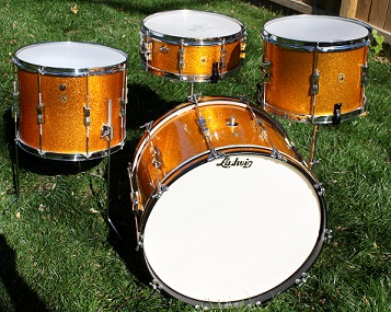 still working on the sbp clubdate kit. here is the galaxy. its much like your gold sparkle. early 60's 22 with the top dead center mount like yours. 13 with diamond mount and hoop mounted clipper. and the 12x15 floor tom. the tom was made from a virgin 12x15 shell that Ludwig had not even drilled. the wrap on the floor tom is the new galaxy that Ludwig has.