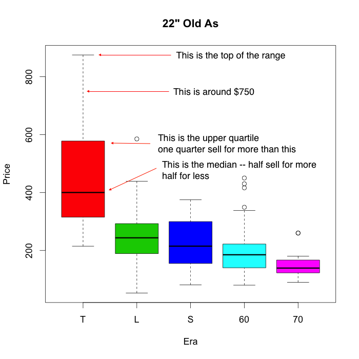 Statisticians are sticklers for definitions for good reason. You can see a more detailed discussion of how the box-and-whiskers plot is programmed following the link below. I realize a fair proportion of people don't follow links let alone read much before their eyes glaze over because it is about mathematics, but it is there as the formal definition. If you have a look you will see how I simplified the explanation I gave above. I could get away with that because in the case of 22" Trans Stamps there weren't any outliers shown and I checked the highest price in my raw data.