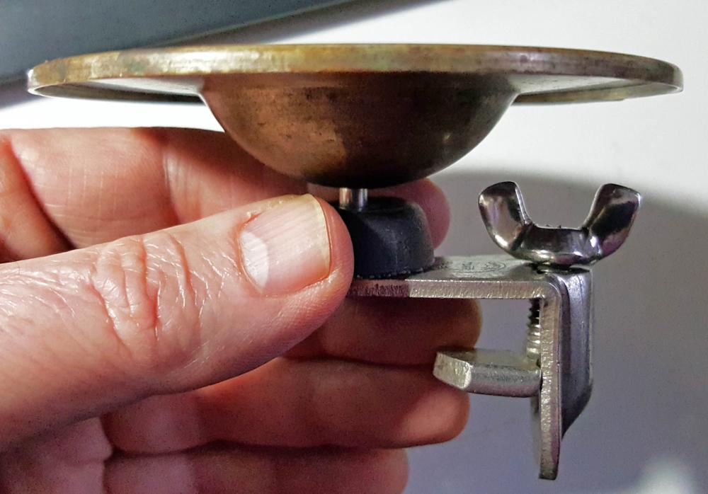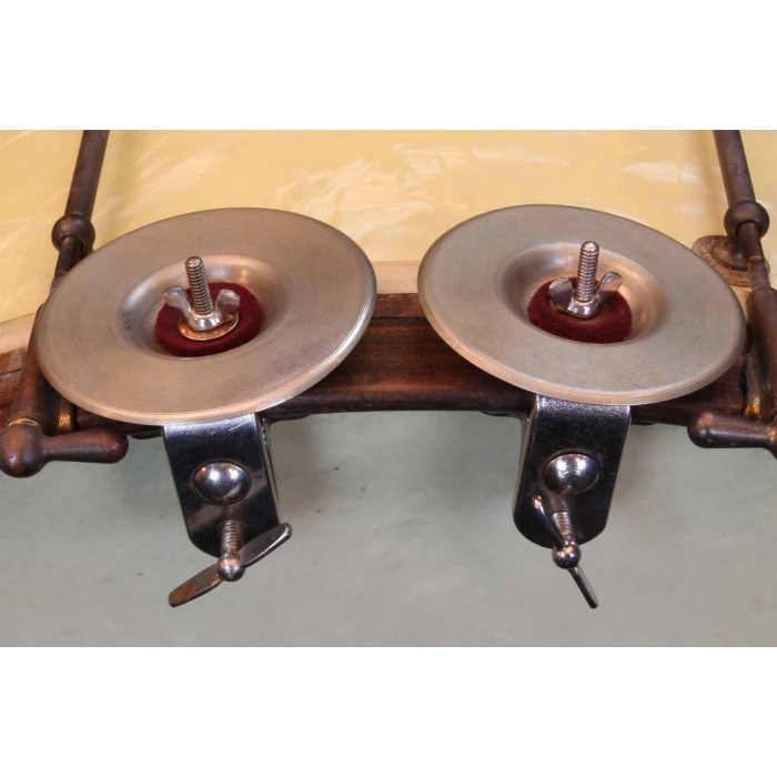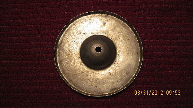 Elton made hardware, attachments, tailpieces, resonators for banjos, & other miscellaneous things, mostly for string instruments. This object may resemble a cymbal, but it looks like a part to something else.