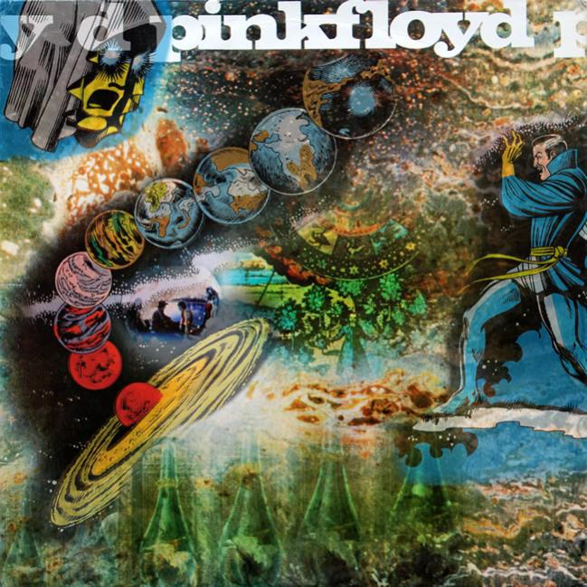 “…The cover is an attempt to represent things that the band was interested in, collectively and individually, presented in a manner that was commensurate with the music. Swirly, blurred edges into red astrology/Dr. Strange images merging into images, a million miles away from certain pharmaceutical experiences. Beginning with Saucerful, they were beginning to experiment with more extended pieces and the music would cascade and change from thing into thing.”