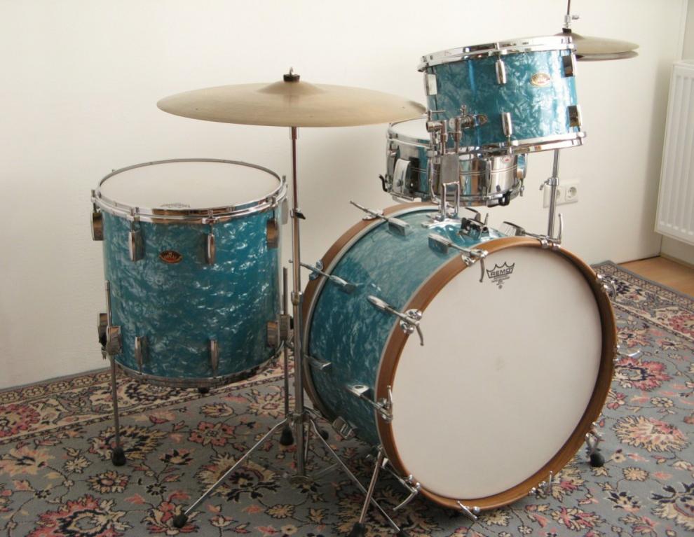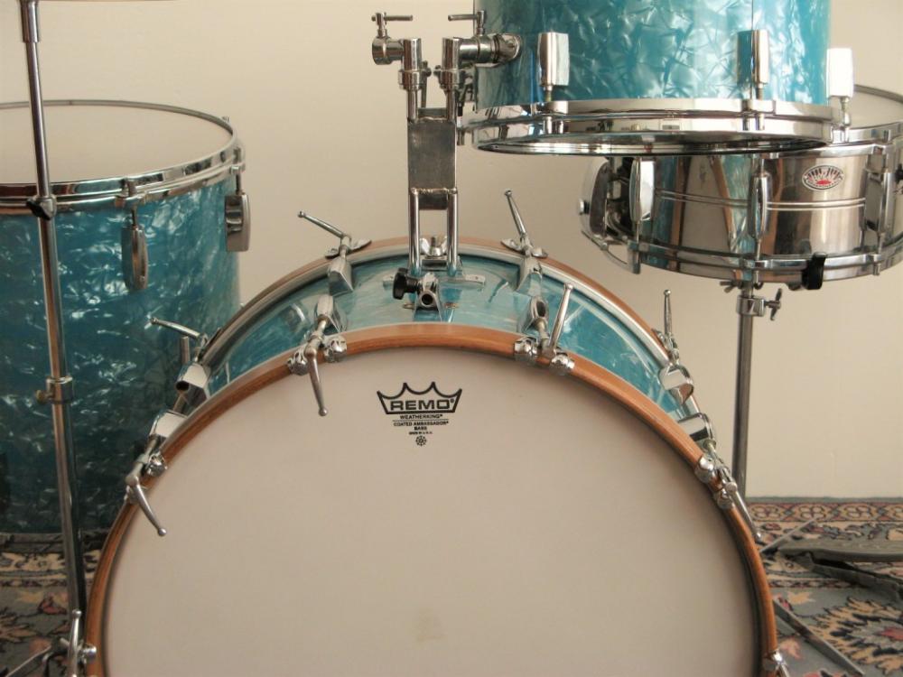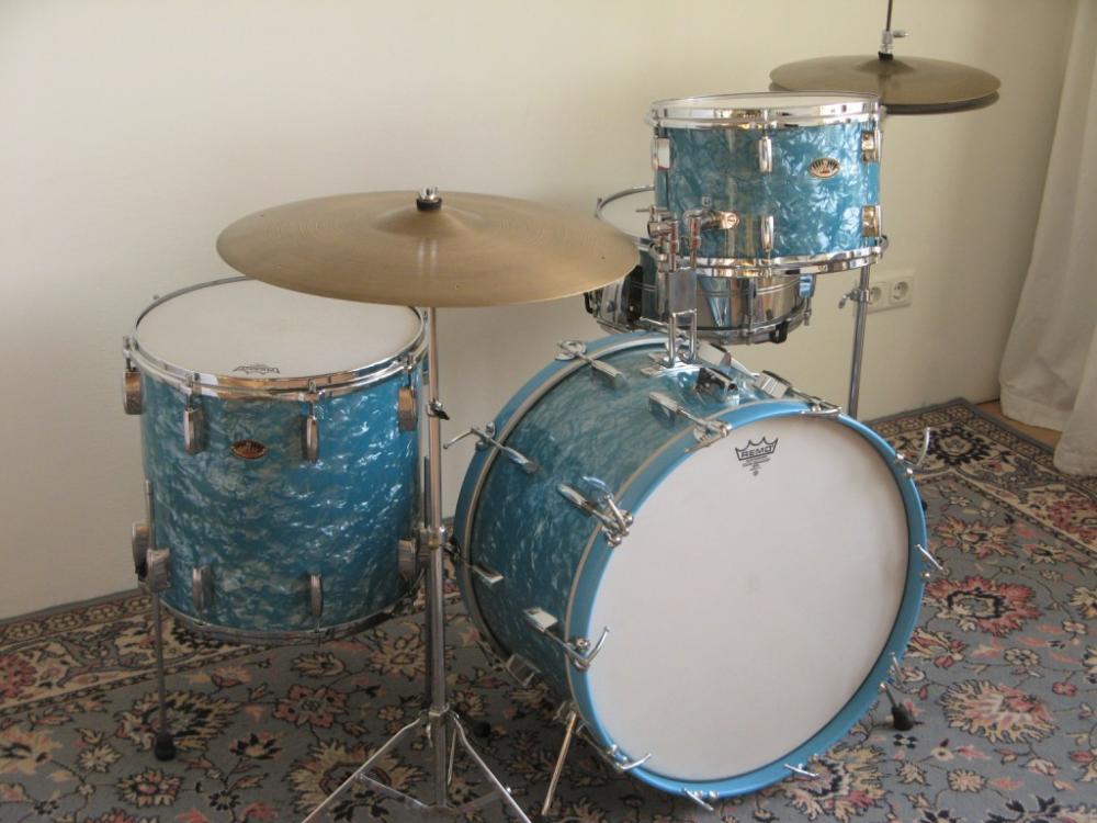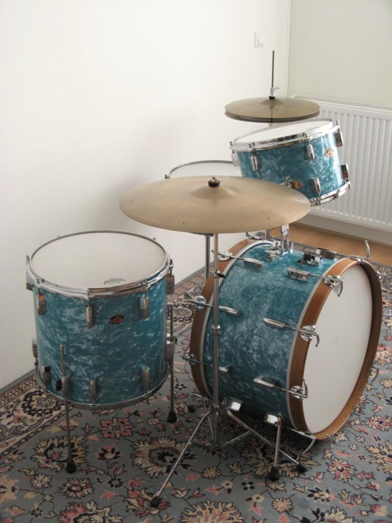 This is an unque drumset made in Amsterdam in the late 50's or early 60s. The 2-man company Royal mainly produced snaredrums but also made drumsets to special order. This set is birch with COB hardware all around, the sizes are 22-13-13-16. Yes, there are two 13 inch rack-toms, only one is shown. The snare (completely NOB) matches this kit and is 14 x 6. The original hoops were light blue, but that was not very much to my taste, so I changed for some home made mahogony hoops; I like a little contrast.