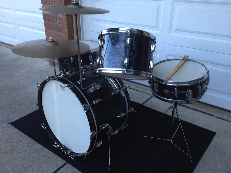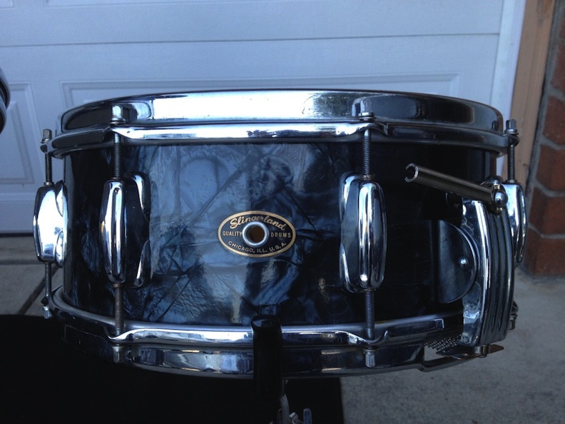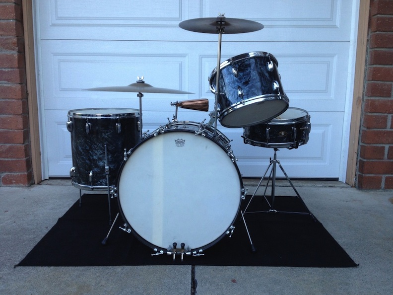 Hola Amigos...just wanted to share pics of my latest purchase. I picked up a '57 Slingerland Gene Krupa Deluxe 1-N ensemble. It has a 22" bass drum, 16" floor tom, 13" rack tom and matching 5.5 x 14" 1-ply Super Gene Krupa snare in my favorite wrap...black diamond pearl. The kit is super clean with no extra holes or issues of any kind. It was said that the original owner kept this kit in storage for 30 years, and judging by the condition, I'm inclined to believe it. This is the reason I'm selling my 2006 Ludwig Classic Maple kit...and I'm ok with it! I am a happy, happy man.
